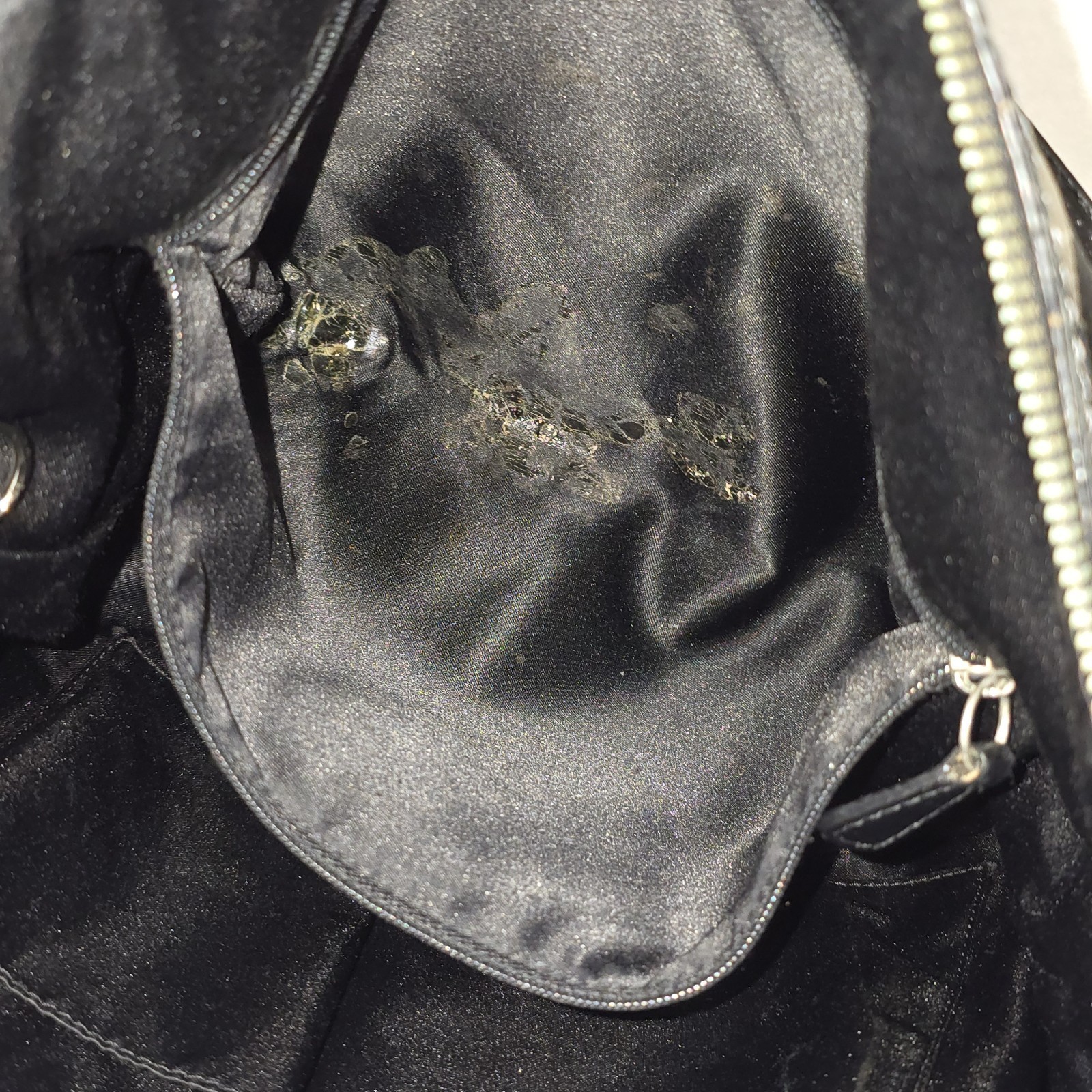 ***Very good preowned condition overall. Interior is clean black satin lining, except inside the zippered pocket where the lining has deterioration (coating breakdown). There are no holes, but the area looks unattractive. This does not affect use. Comes exactly as pictured. Please see photos.***