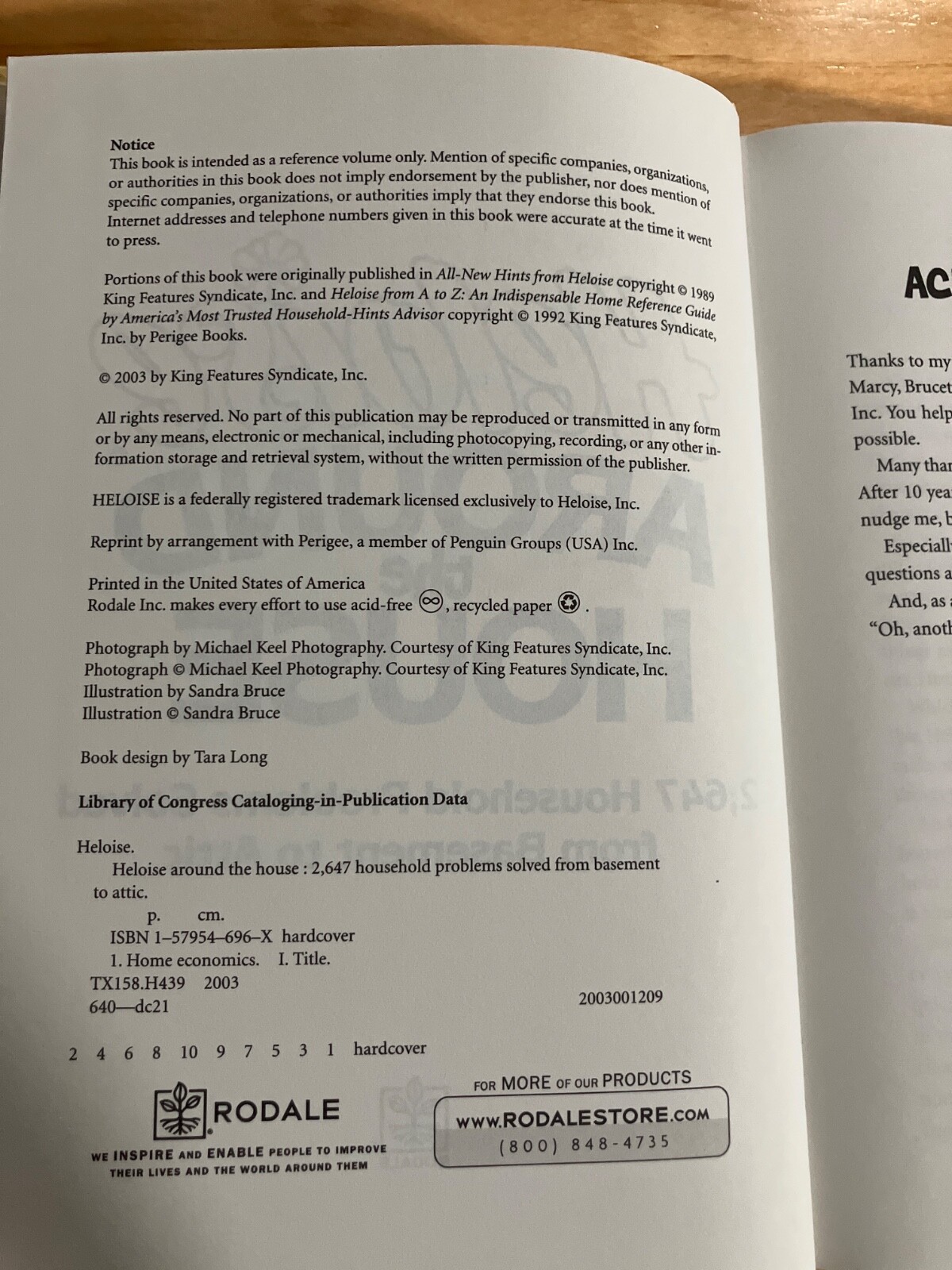 The Heloise book "Around the House" was published in 2003 by Rodale Books. The book, titled "Heloise Around the House: 2,647 Household Problems Solved from Basement to Attic," offers a wide range of tips and solutions for various household issues, covering topics from cleaning to gardening.