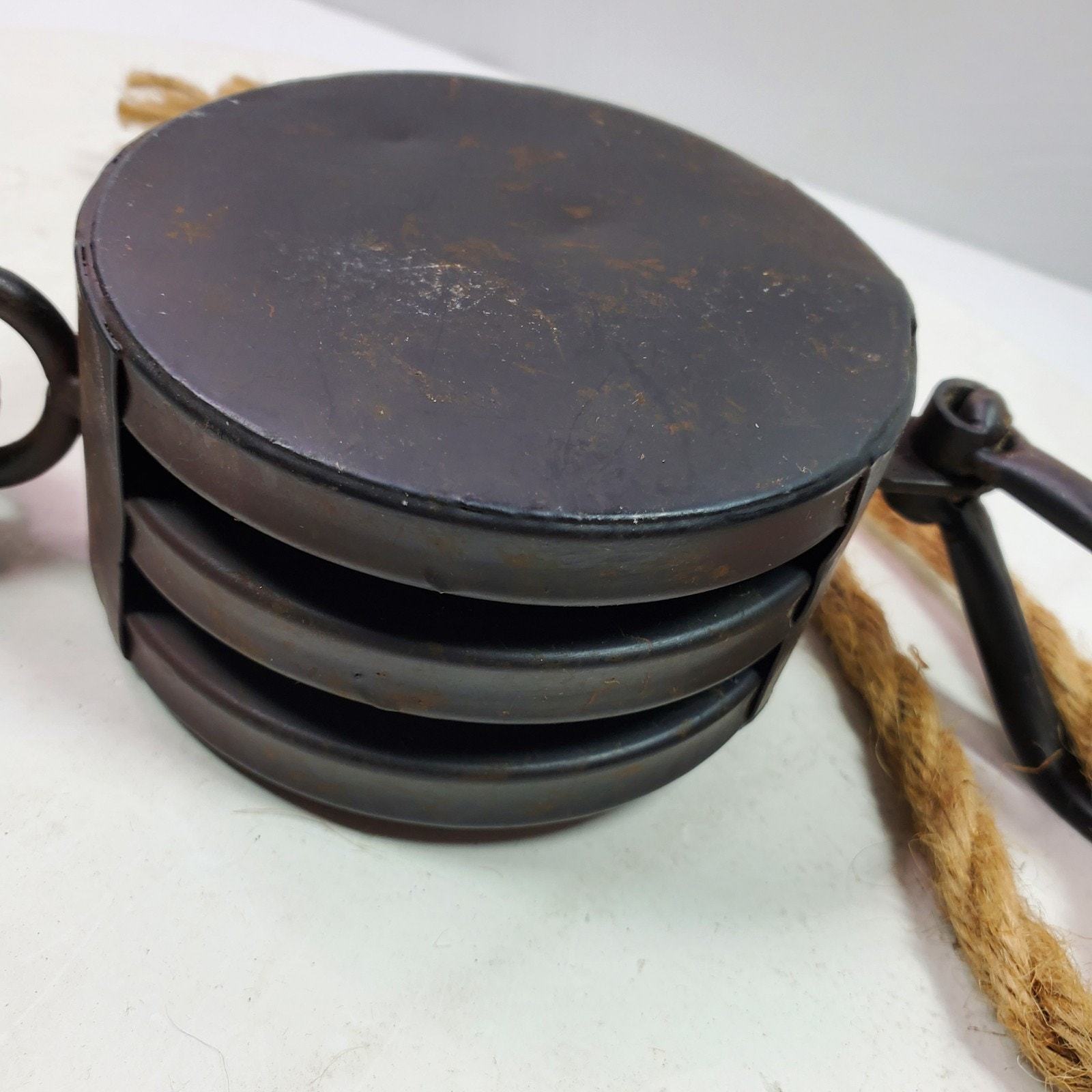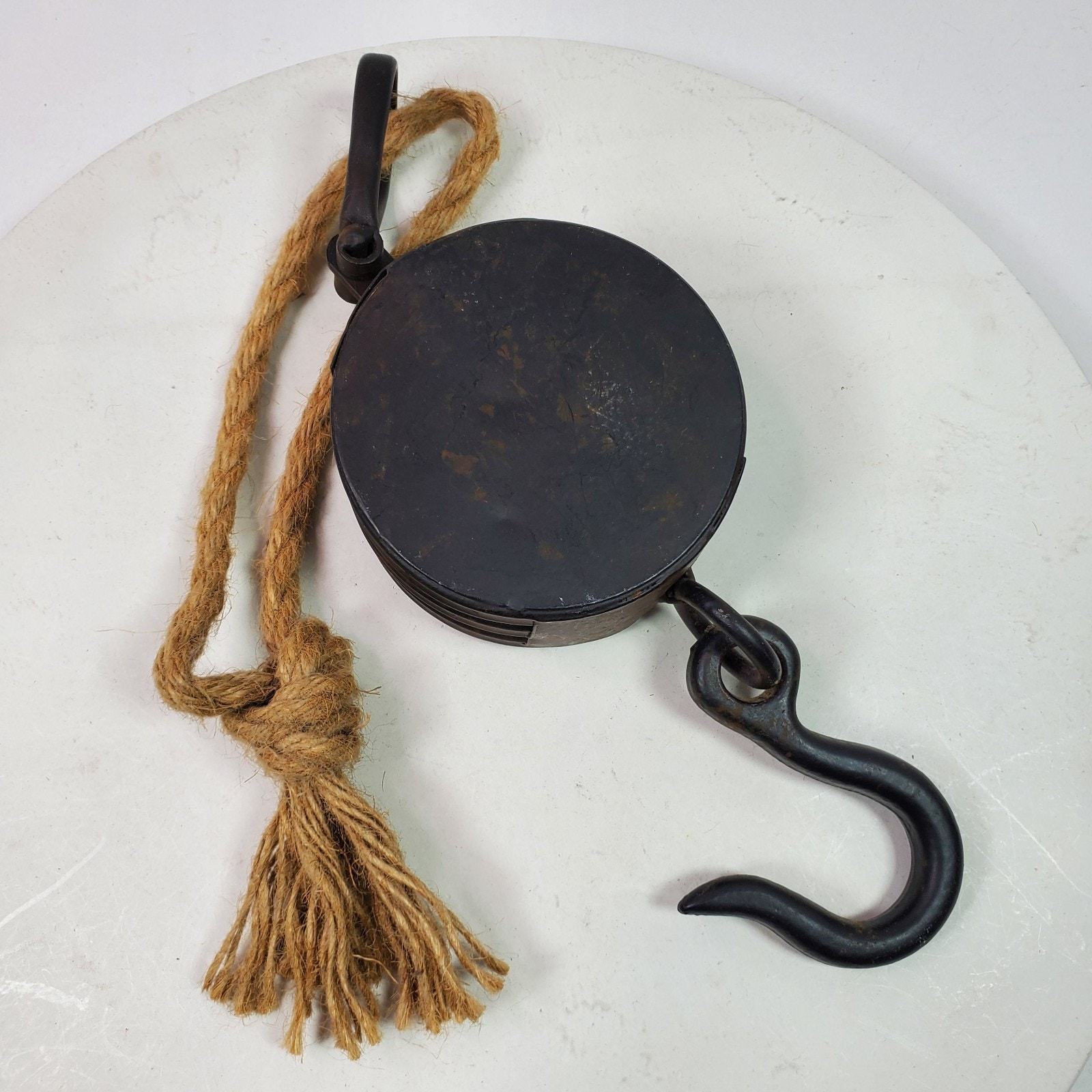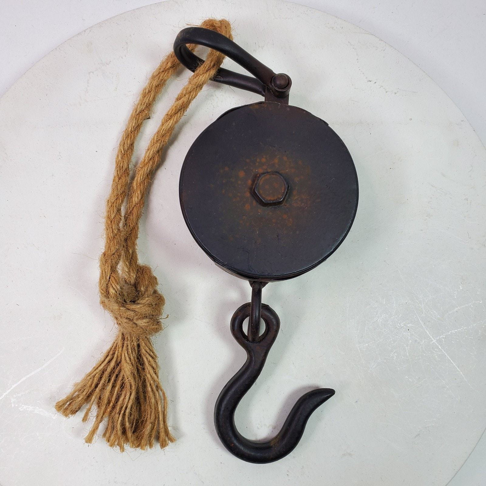 Vintage Farmhouse Metal Decor Pulley w/ Rope 19 inches Decor Garage Barn