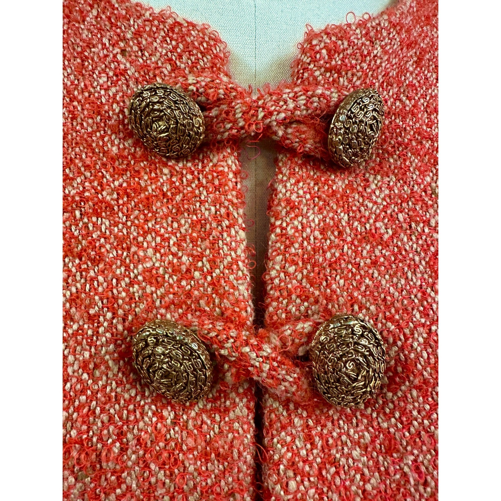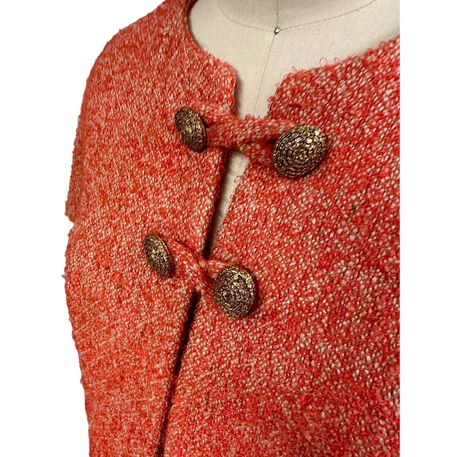 Boucle wool tweed in orange; brass buttons with loop closures; partial lining; small metal zipper at skirt; Adele Simpson label.