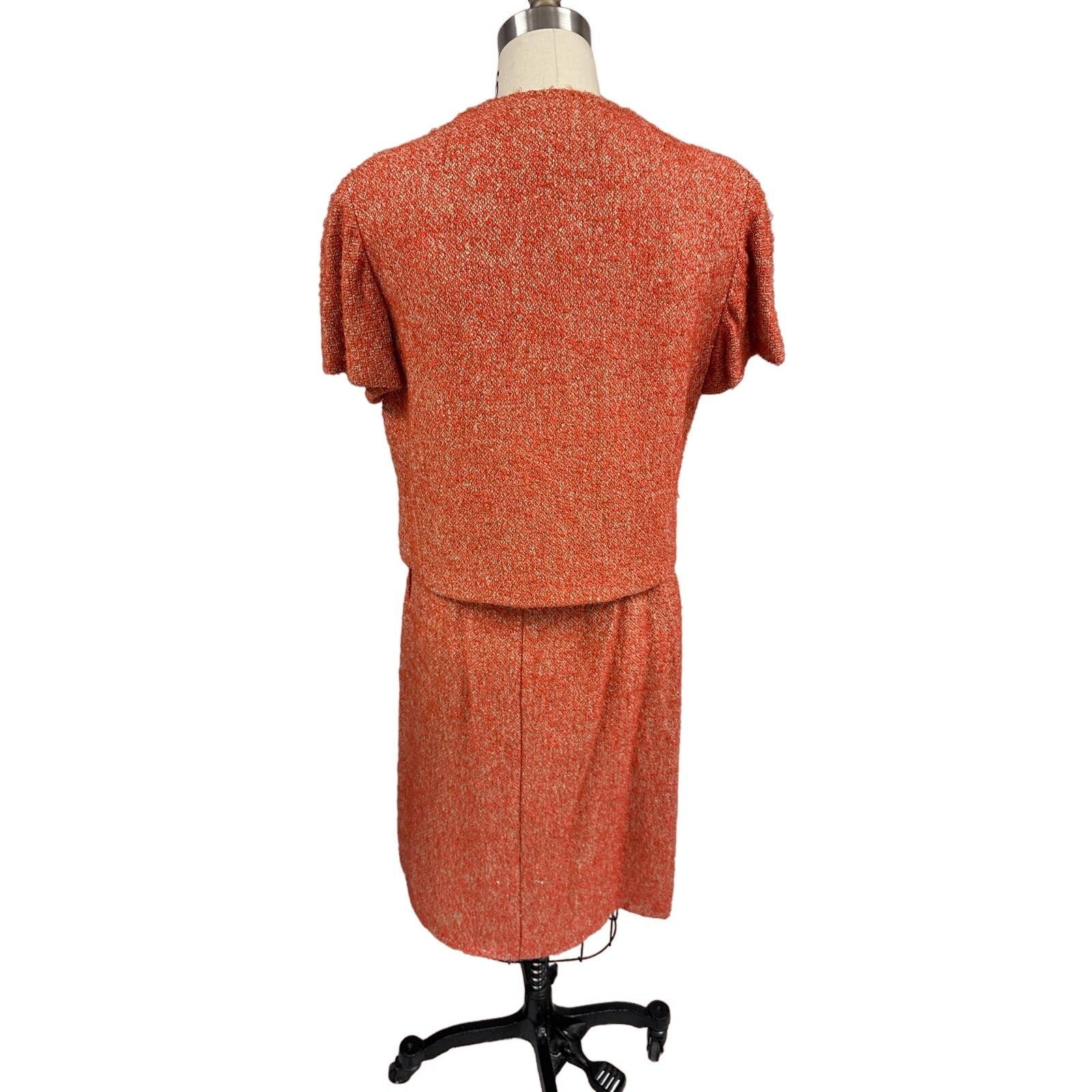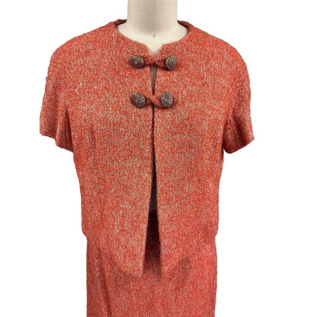 Vintage 1960s Adele Simpson skirt suit, size S (jacket bust 40?, skirt waist 26?), tailored in orange tweed boucle wool. The jacket is loosely cut with short sleeves, charming loop closures, and elegant brass buttons at the neckline. The straight skirt features a side metal zipper and matching boucle construction. A chic designer ensemble with refined mid-century appeal.