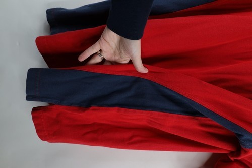 Holes side slits. Collar, sides discolored. Color faded. Pilling