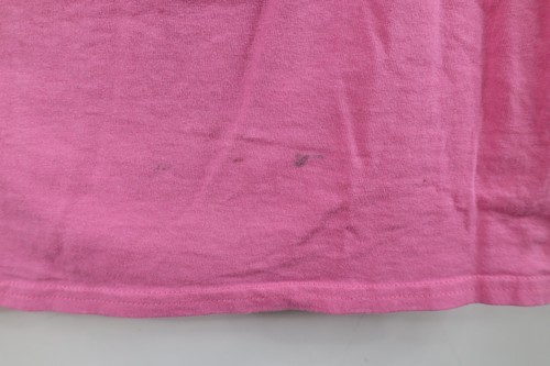 Stains front. Blemishes shoulders, back top. Collar, armpits discolored. Graphics, color faded. Pilling