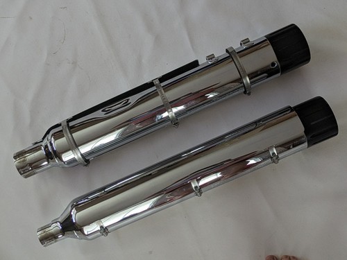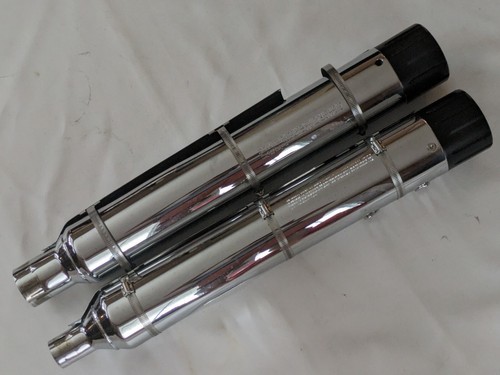 Enhance your Harley Davidson motorcycle's performance with these high-quality slip-on mufflers. The mufflers come in a sleek chrome finish and have black tips that add to the aesthetic appeal of your bike. These mufflers have a universal fitment, making them compatible with most street motorcycles. Crafted from durable stainless steel, these mufflers are easy to replace and feature a slip-on mounting style. The mufflers have an outlet diameter of 4 inches and a diameter of 1.75 inches and 2.5 inches. These mufflers are suitable for left and right rear placement on your motorcycle. Upgrade your motorcycle's exhaust system with these premium mufflers.