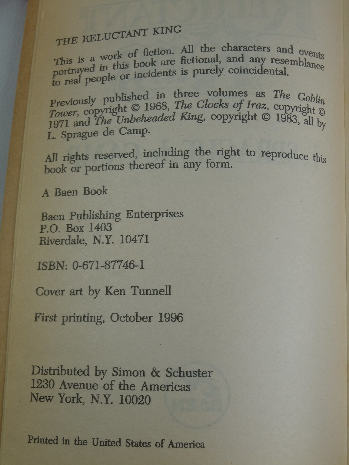 The Reluctant King by L. Sprague de Camp is a complete fantasy novel compiled into one volume, originally published in three separate works: The Goblin Tower (1968), The Clocks of Iraz (1971), and The Unbeheaded King (1983). This edition, published by Baen Publishing Enterprises in October 1996, features cover art by Ken Tunnell and is the first printing of this collected volume.