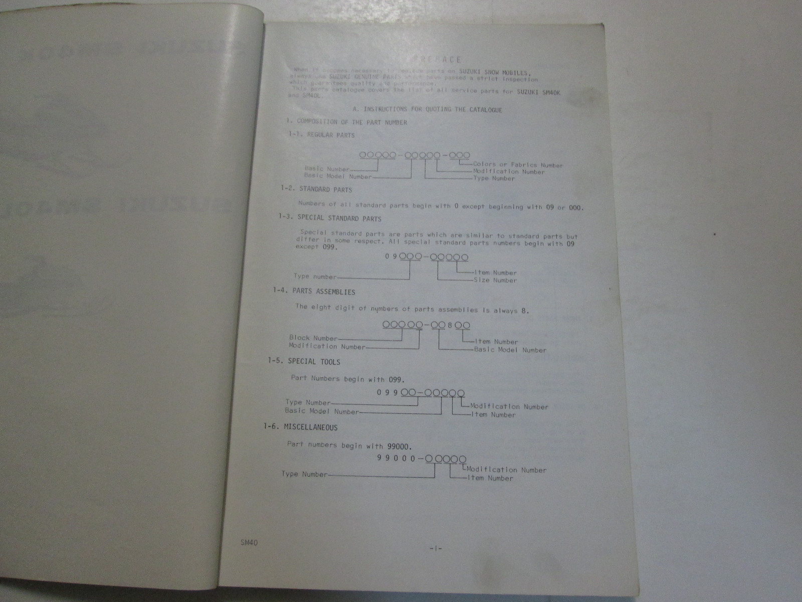 Informative with illustrations, covers PARTS INFORMATION, exploded illustrations and/or diagrams, great manual to have when you own a SUZUKI SM40.