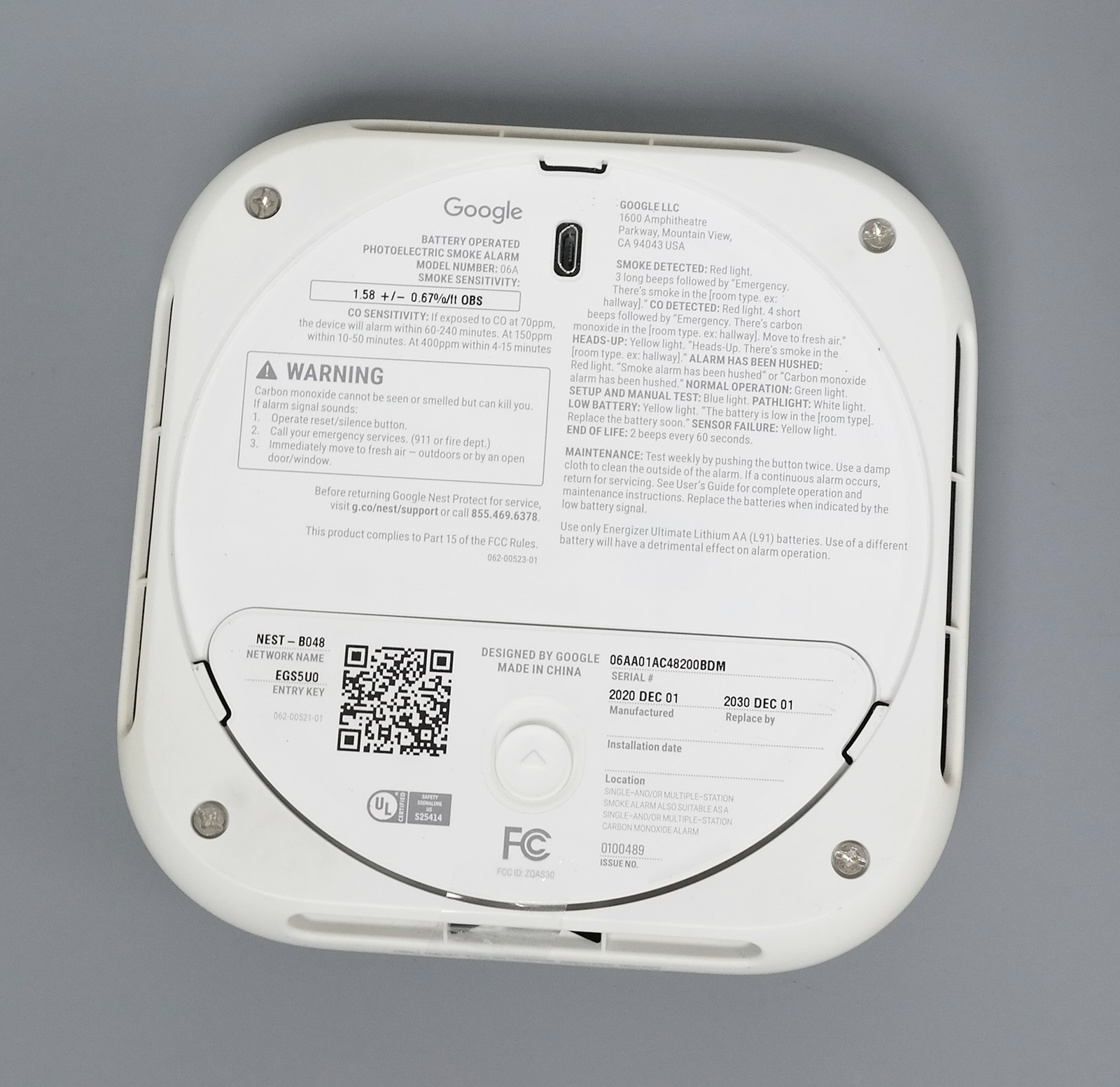 Google Nest Protect 2nd Gen S3000BWES BATTERY Smoke and Carbon Monoxide Alarm