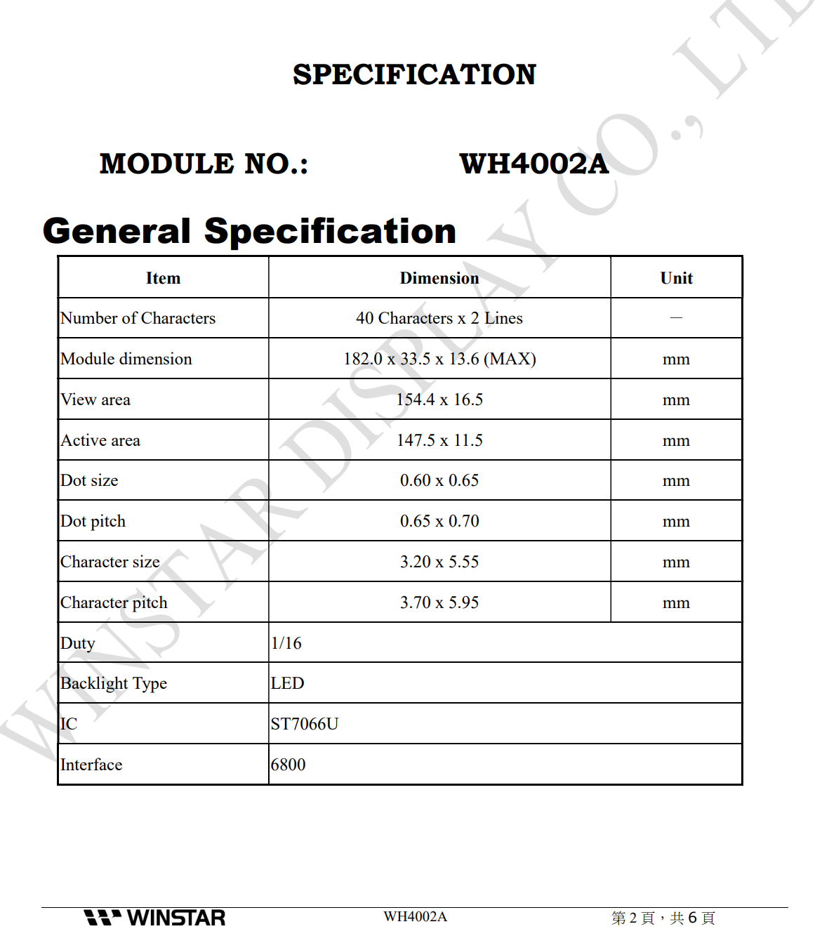 WH4002A-YYH-JT Winstar 40x2 Character LCD Display YG LED Backlight WH4002A