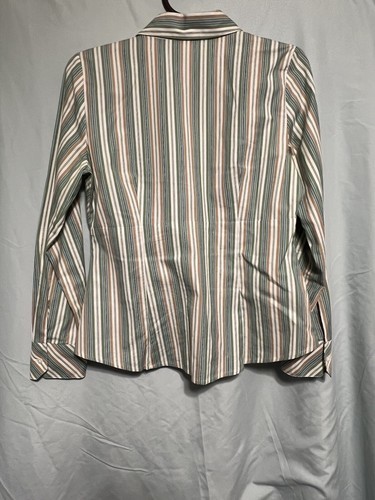 Elevate your wardrobe with this beautiful Ann Taylor Petites button-up top. The striped pattern and multicolor scheme make it a versatile piece that can be easily incorporated into any outfit. The long sleeve design adds a touch of sophistication, while the size 6P fits comfortably for a flattering silhouette. Perfect for any occasion, this top is a must-have addition to any woman's clothing collection.