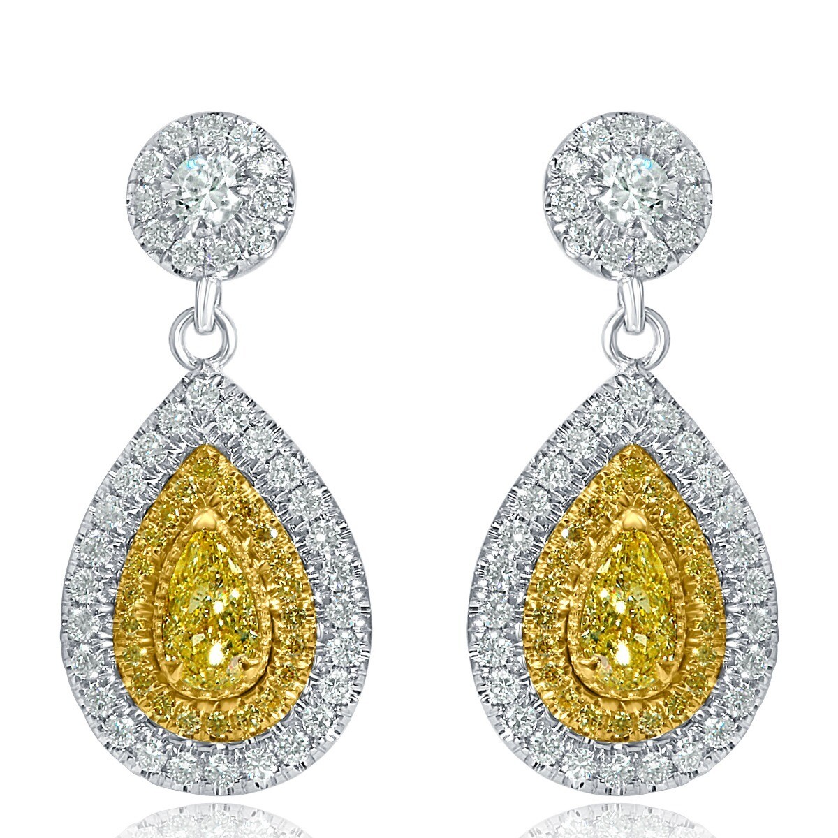 Handcrafted in 14k two-tone gold, these earrings feature 0.60 carat pear brilliant cut natural fancy yellow diamonds in double halo of yellow and colorless round cut diamonds in pave setting, attached to screw back closure by round cut colorless diamonds. These stunning teardrop diamond earrings are perfect for your wedding day or special occasion.