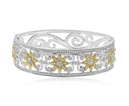 Este impresionante brazalete de brazalete de diamantes esta elaborado con 30.2 gramos de oro blanco de 14k, con delicados acentos de flores de oro amarillo ubicados entre dos hileras de diamantes espumosos. Cuenta con un total de 2.50 quilates de color G/H incoloro, VS/SI Clarity 261 diamantes de corte redondo en un deslumbrante pavimento y entorno de bisel. Diseñado para adaptarse a una muñeca de 7 ", este brazalete mide 17.7 mm de ancho, ofreciendo una sensacion sofisticada y sustancial. Las mediciones de brazalete son 2 1/2 x 2 1/4 pulgadas. Perfecto como regalo de aniversario o para cualquier ocasion especial, este brazalete es un verdadero testimonio de la belleza atemporal y la artesanía experta.