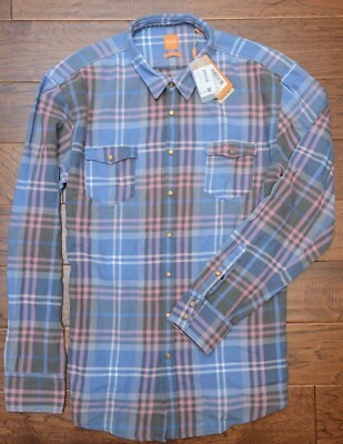 Dans la boutique, vous trouverez egalement des accessoires appropries (veuillez cliquer sur l'image) Hugo Boss Men's Edoslime Slim Fit Open Blue Check Flannel Cotton Casual Sport Shirt