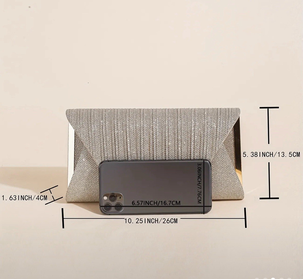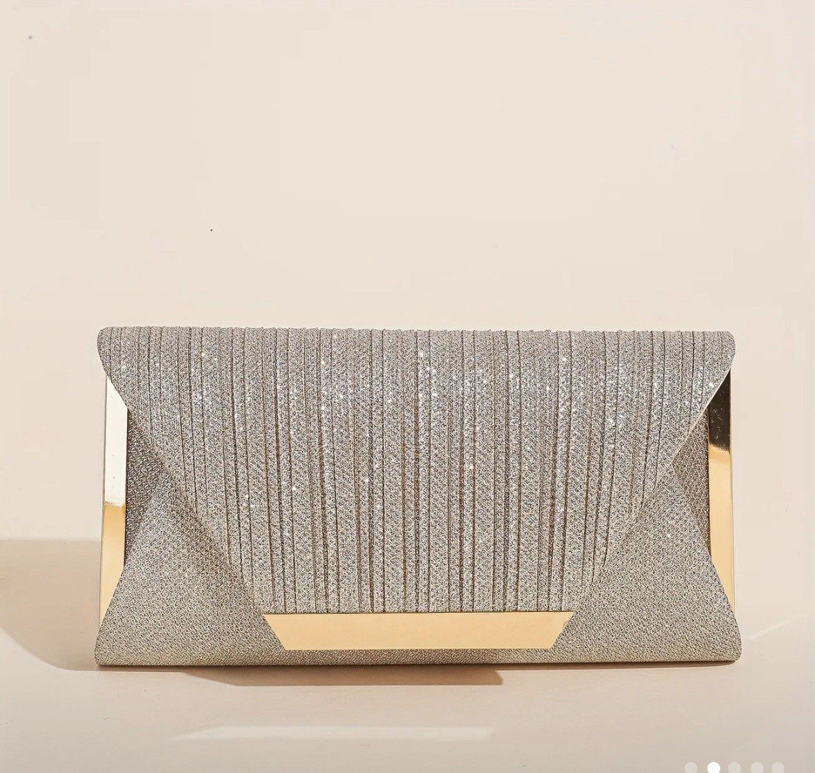 Elegant Champagne Glitter Clutch Purse for Women - Detachable Golden Chain Strap Magnetic Closure, Pleated Design Wedding, Prom, Party Evening Bag with Polyester Lining, Wedding Purse, Formal Event, Sophisticated Style, Durable Lining, Women's Handbag, Women's Fashion, Prom Accessory, Highquality Handbag, Bridal Accessory