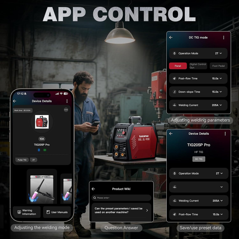 [APP-CONTROLLED TIG WELDER] - The ARCCAPTAIN TIG 205P Pro can be controlled via the ARCCAPTAIN APP. Users simply scan the barcode on the welder to connect their phone. It supports real-time monitoring of welder status, welding mode selection, parameter adjustment and preset recall, error code analysis, FAQs, and welding result sharing for educational purposes. Join the ARCCAPTAIN welding community and enjoy endless welding fun!