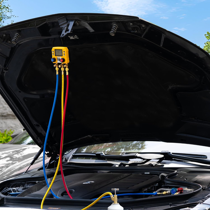 HIGH ACCURACY AND COMPATIBILITY: The upgraded 3-way manifold gauge set features a broad pressure measurement range from -14.5 to 800 psi with 0.5% FS pressure accuracy; Supporting 88 types of refrigerants, you can easily select the correct refrigerant for accurate pressure readings; Before charging, various types of working refrigerants can be set based on the car's charging requirement; You can observe the refrigerant charging status through the visual window