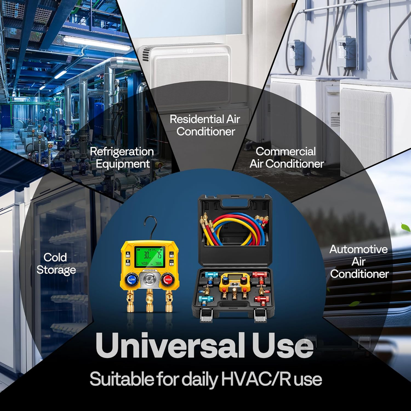 USER-FRIENDLY DESIGN: Features a large LCD screen with backlight and zero-level menu design, it provides easy-to-read data results even in dim lighting; Equipped with intelligent APO function to detect idle status and shut down automatically, saving energy; In addition, the manifold gauge features precise pressure-hold leak testing, along with automatic multi-unit pressure conversion and Celsius/Fahrenheit temperature switching to meet various needs