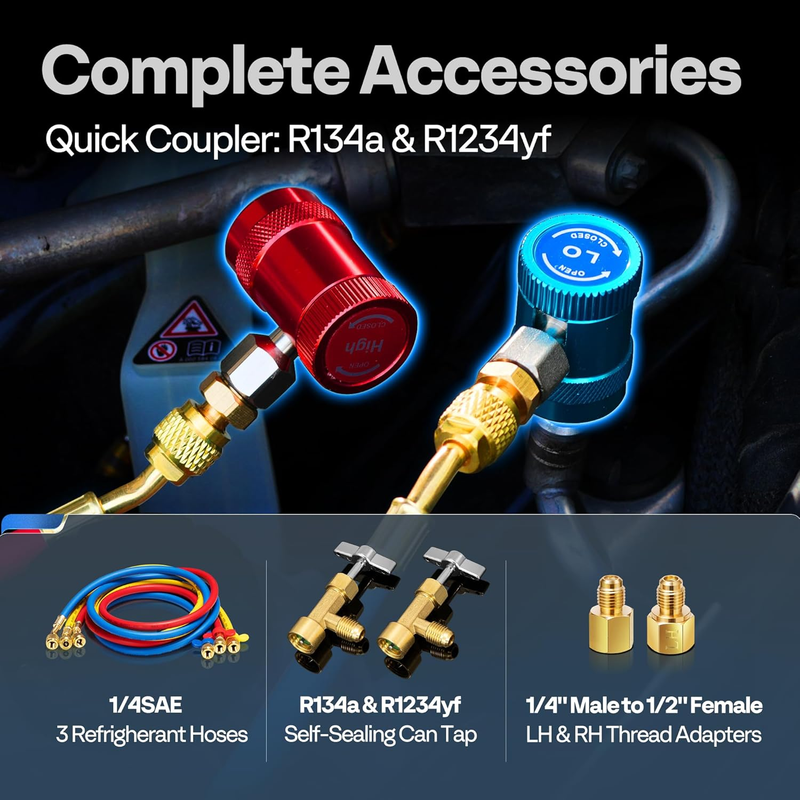 Complete Accessories: Comes with a heavy-duty hose set (three hoses with shut-off valves) for fast and efficient system analysis and optimization; Includes R-134a and R-1234yf quick couplers, as well as R-134a and R-1234yf self-sealing can taps for broad vehicle compatibility; A hook allows you to hang the gauge for hands-free operation, and the included carrying bag with shoulder strap makes transport easy; Note: This device requires three AAA batteries which are not included in the package