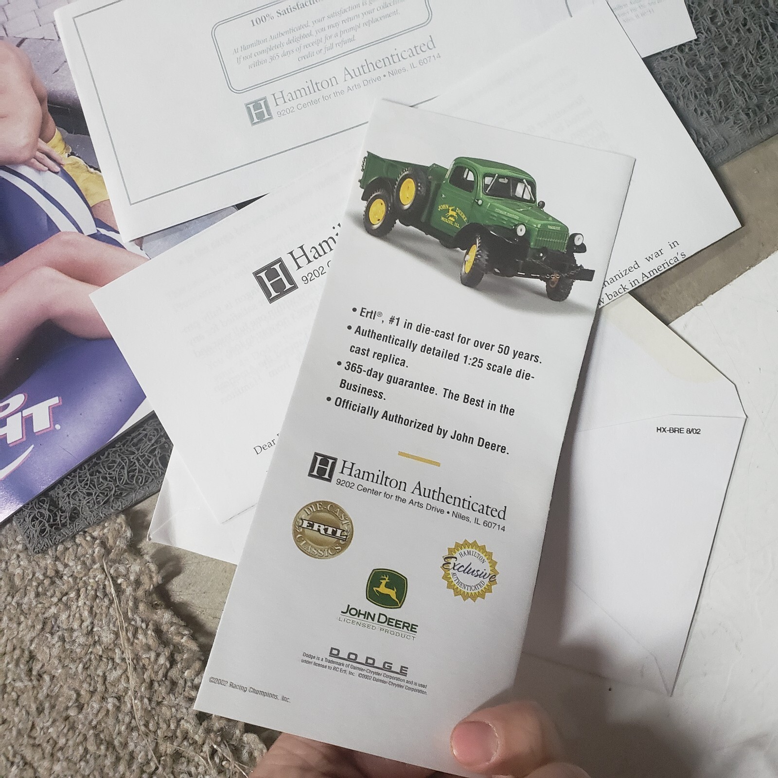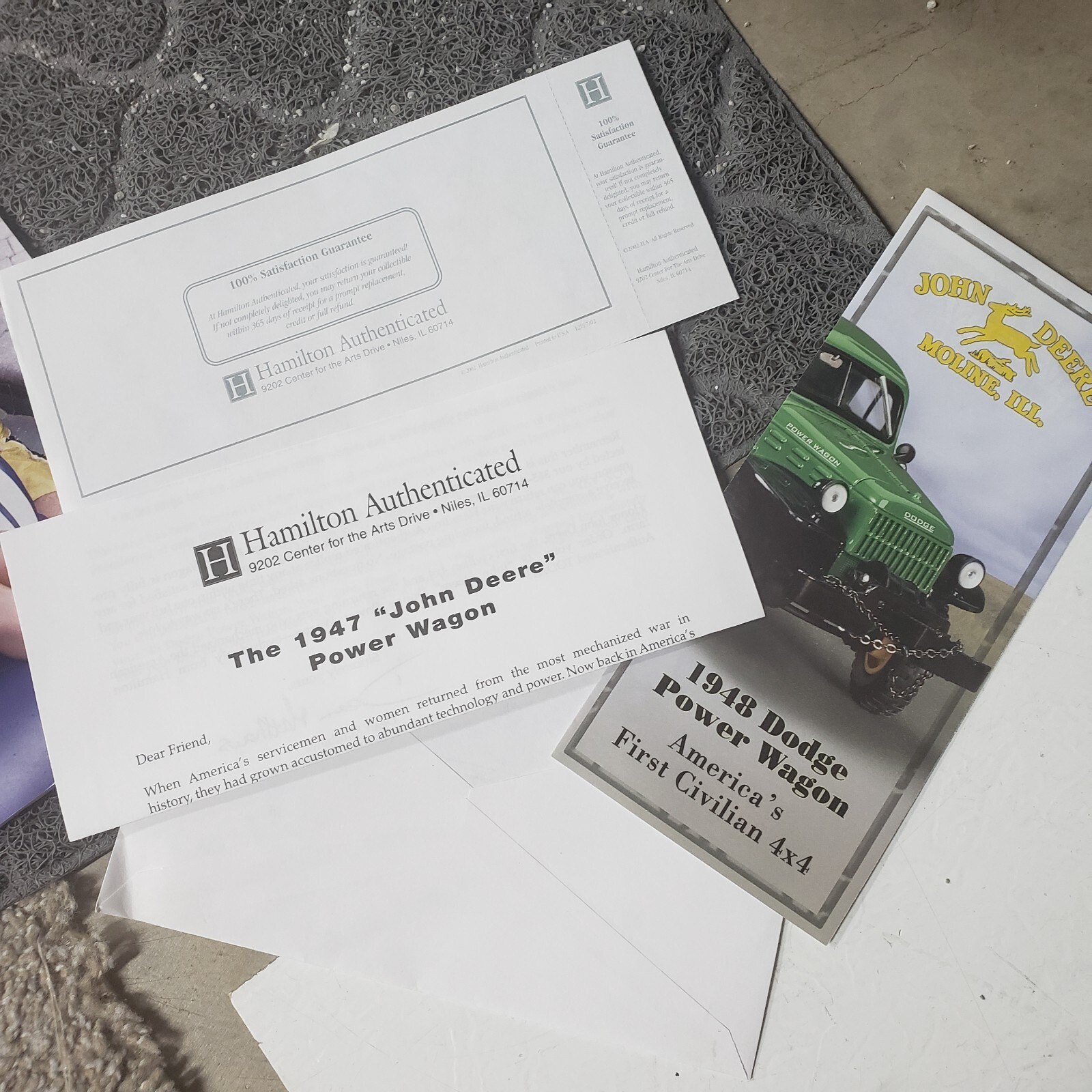 Raro Hamilton Set 1948 Dodge Power Wagon John Deere die Cast Opuscolo di brochure Se possiedi il veicolo a fusione di die, hai bisogno delle scartoffie abbinate !!!! Questa e molte pubblicita e opuscoli per questo specifico cast di dado. Principalmente questo e dal 2000-2001. Si prega di consultare le foto Nave USA gratuita
