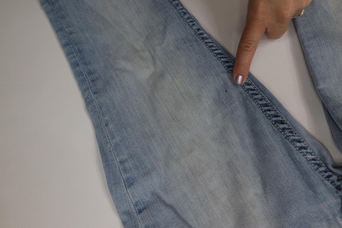 Threadbare /holes upper right and left. Marker stains left leg. Distressed and fade