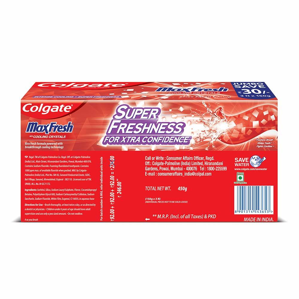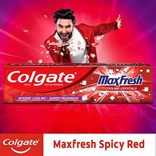 Product description: Switch on the power of freshness with Colgate Maxfresh toothpaste that refreshes you and helps you seize the day because every morning is a fresh start. The red gel toothpaste contains unique cooling cyrstals that give you an intense cooling while you brush. Colgate is India?s most trusted oral care brand. As a trusted partner, we are committed to doing business with integrity and respect for all people and the world around you. Colgate offers quality oral care products, including toothpastes and toothbrushes,as well as expert dental health information. Colgate toothpastes are always 100% vegetarian and gluten free. We care about our environment, Colgate India is the nation's first to earn True Zero Waste Platinum certification for all its four manufacturing sites in India, from Green Business Certification Inc. (GBCI). This toothpaste is made in India, with highest quality standards.