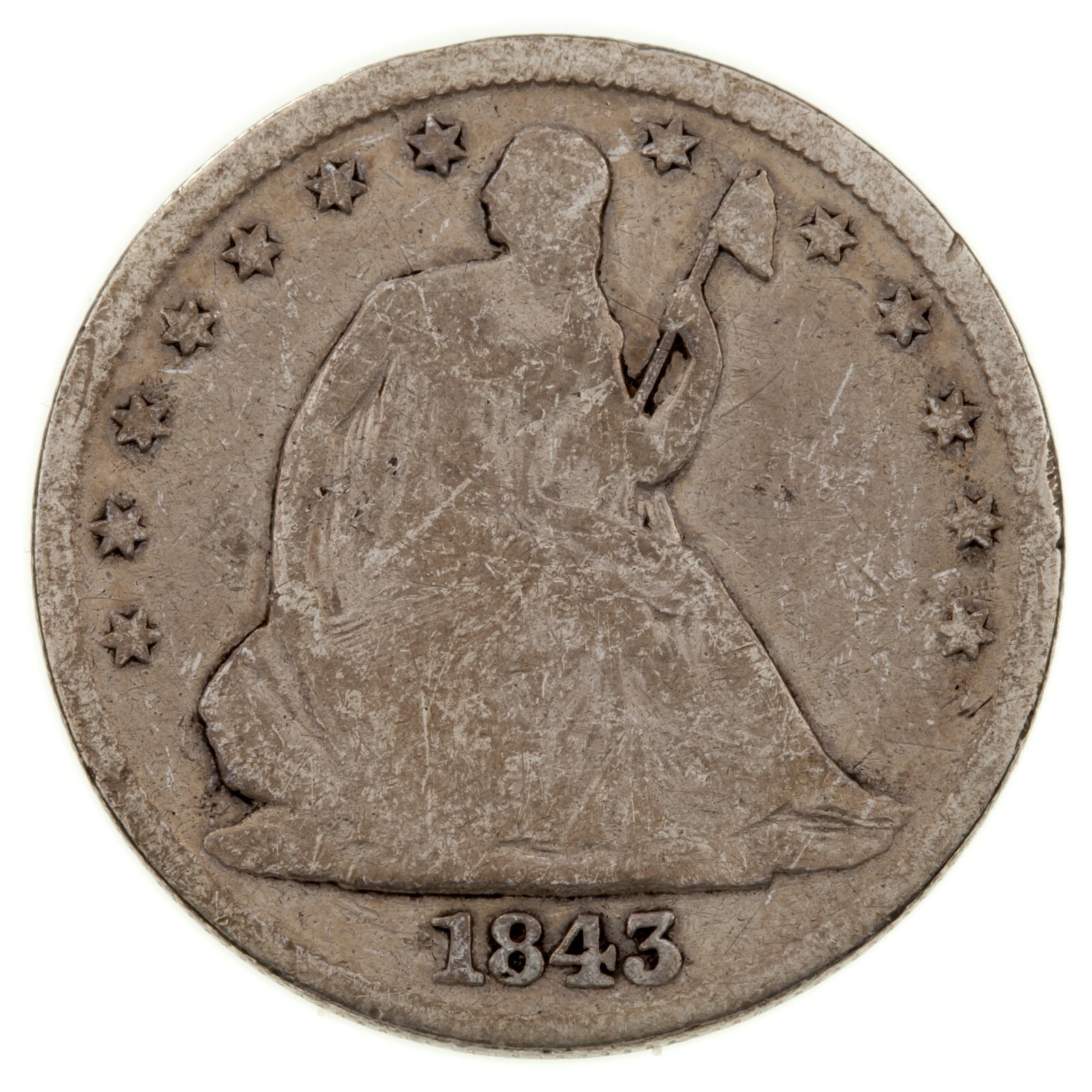 1843 50C Assis Demi Dollar En Bon État, Complet Fort Jantes, Léger Gris
