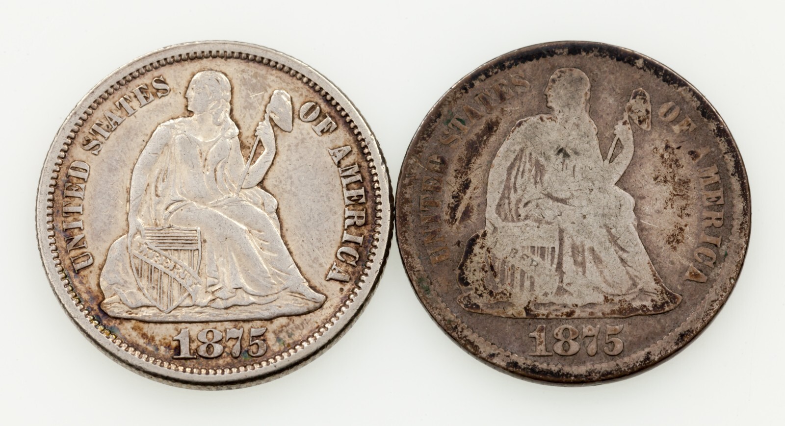 Lot de 2 1875 Assis Liberty Dimes 10c (P / CC) en condition au / VG