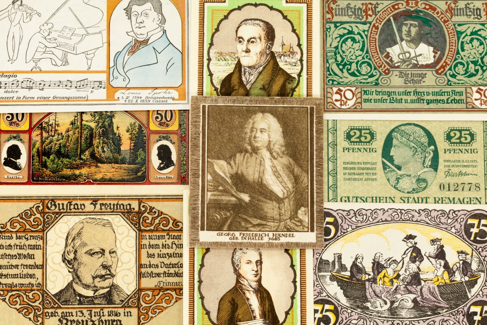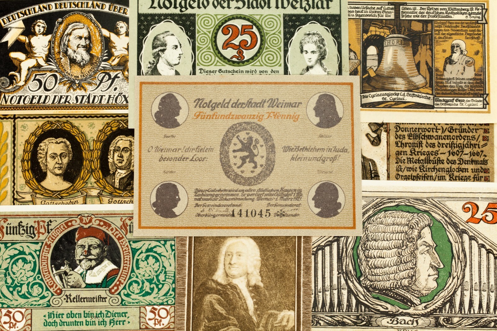 Ce lot comprendra 25 notes de notgeld individuelles d'Allemagne apres la Premiere Guerre mondiale. Valeurs faciales entre 5 pfennig a 5 marque. Theme des personnes celebres.