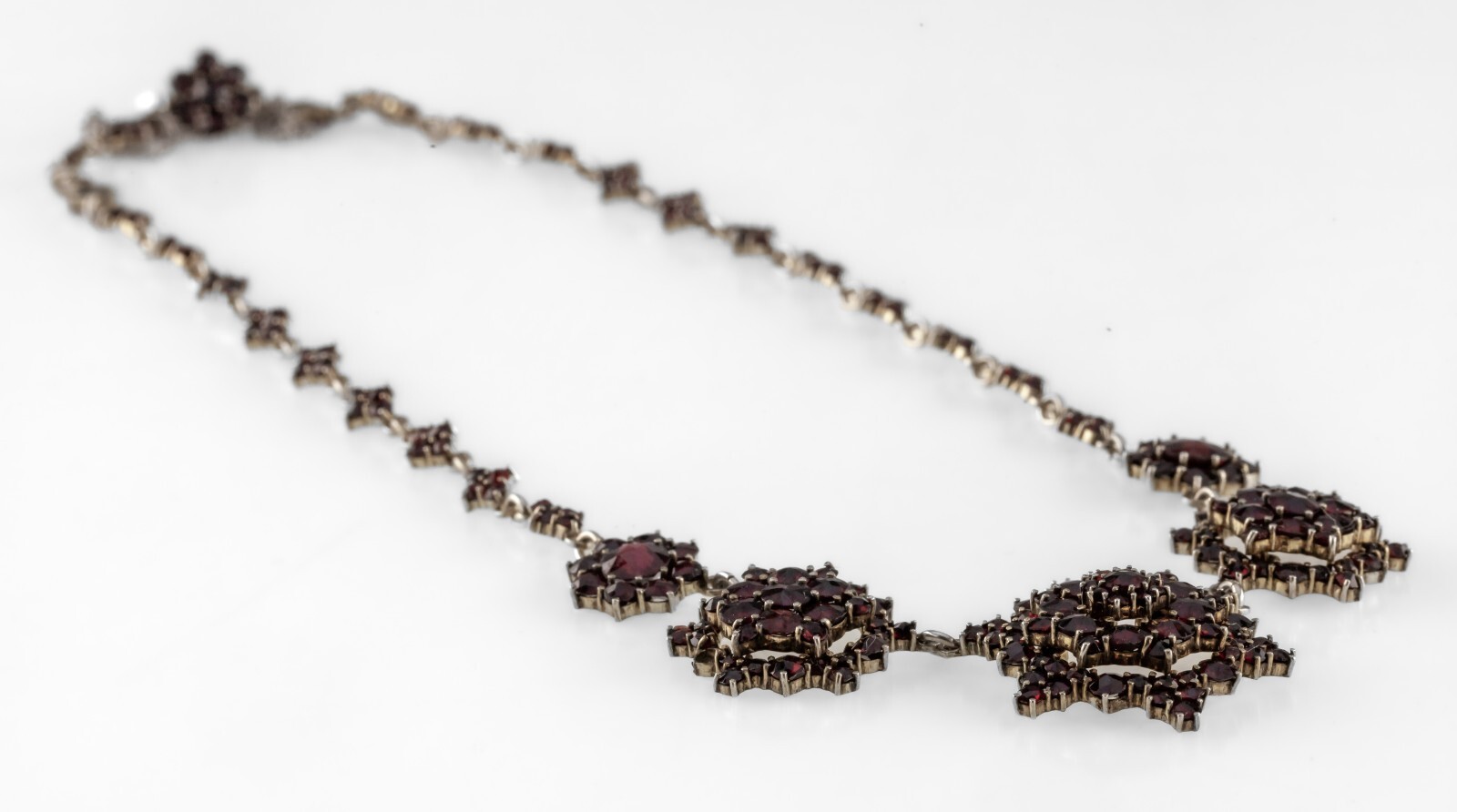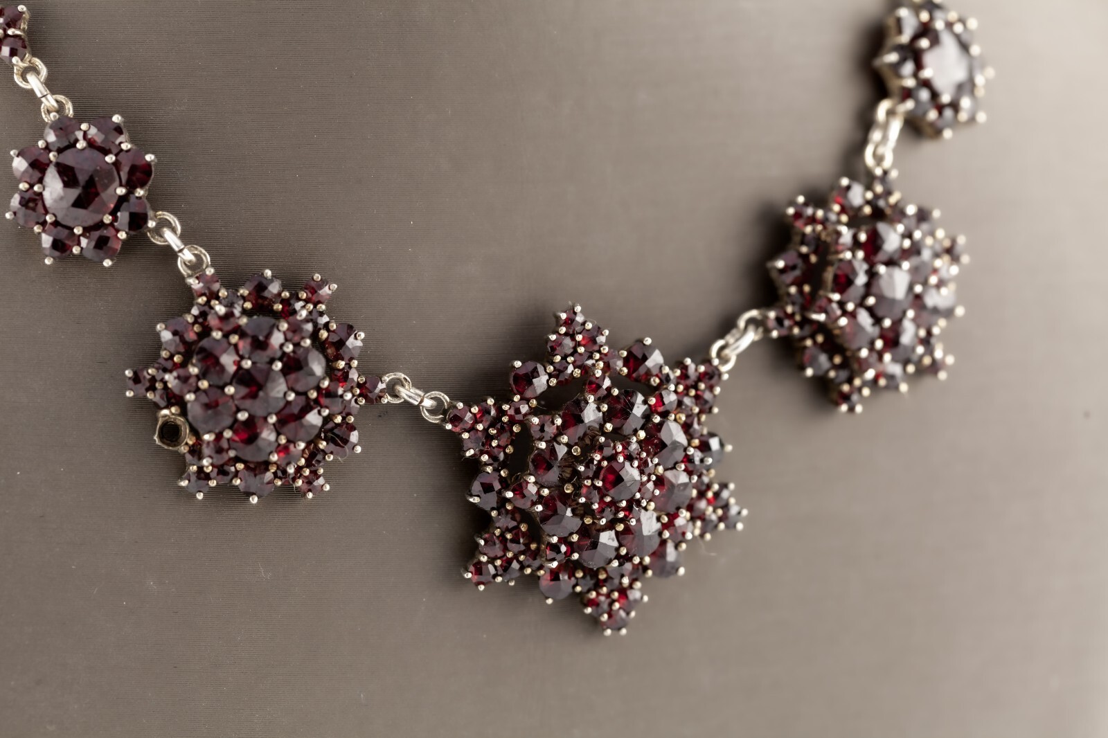 Collier vintage boheme en argent 800 dore avec grappe de grenats et rosettes de 43,2 cm de long