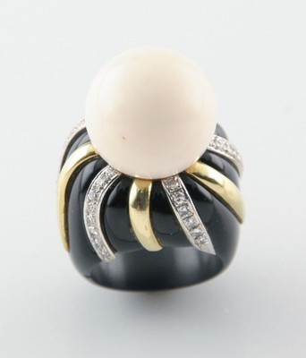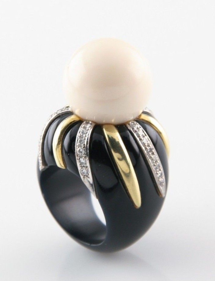 L'anneau en plastique noir comprend une sphere de calcedoine de dix-huit millimetres reglee au-dessus des rubans d'or jaune 18 carats et de diamants