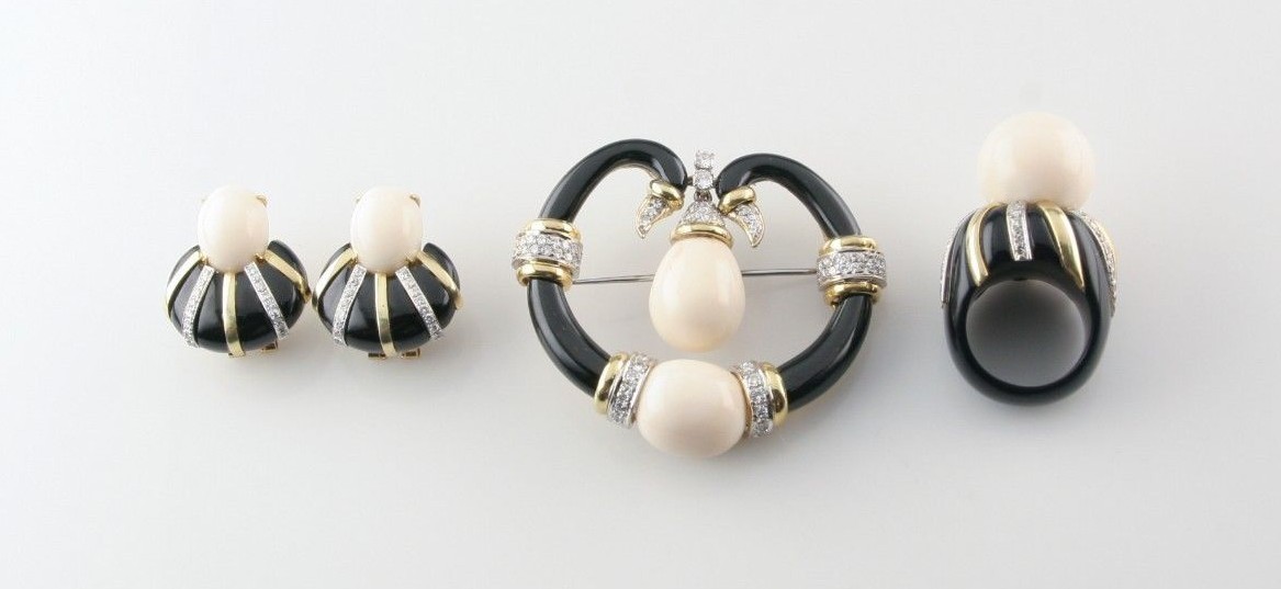 Calcédoine et Diamant 18k or Jaune Ensemble Bijoux W/ Bague, Boucles, Et Broche