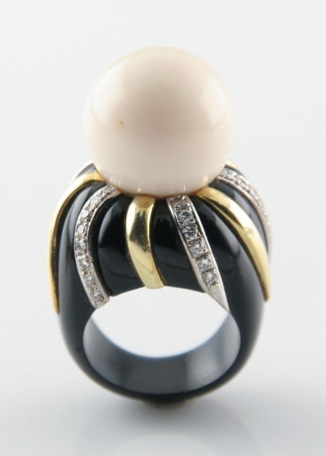 Mesdames Plastique noire et chalcedoine en or jaune 18K et bague en diamant