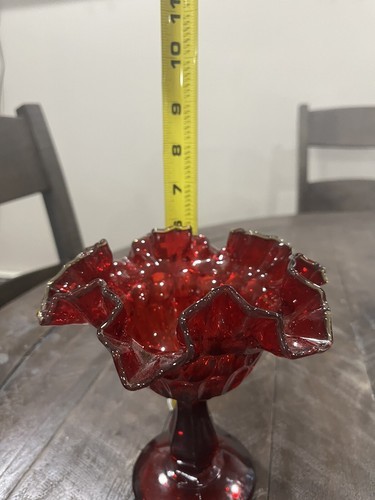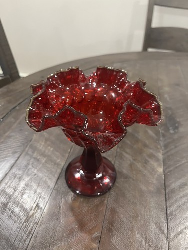 This vintage Fenton compote is a stunning addition to any collection. With its vibrant ruby red color and double crimped foot design, it is sure to catch the eye of any admirer. The gold crest adds a touch of elegance to this beautiful piece, making it a perfect choice for display in any room.