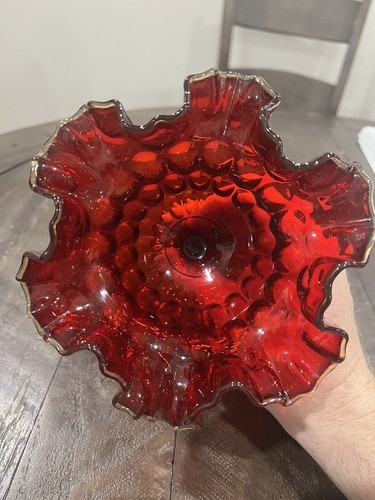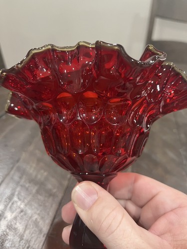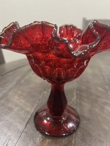 Vintage Fenton Ruby Red Thumbprint Double Crimped Footed Compote Gold Crest