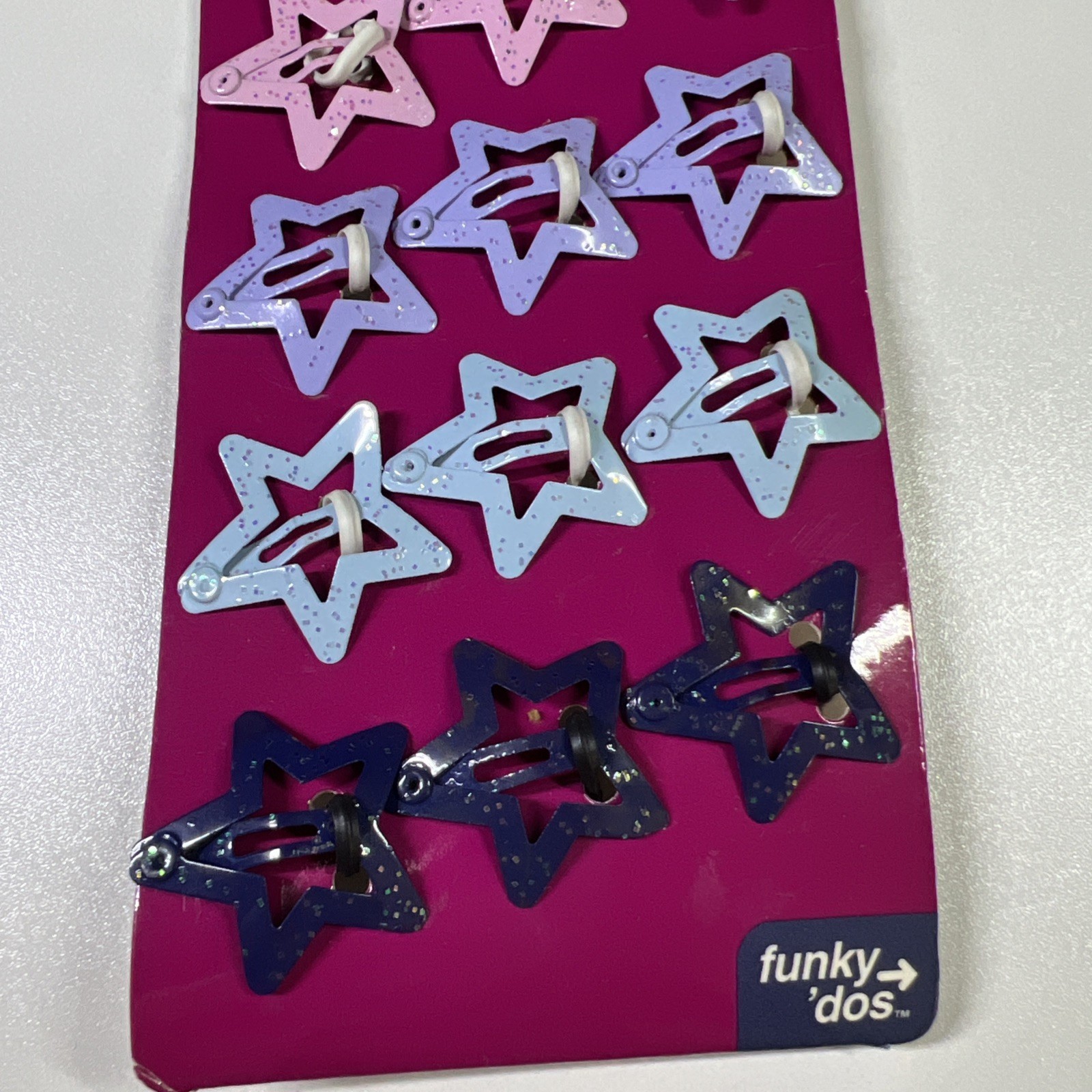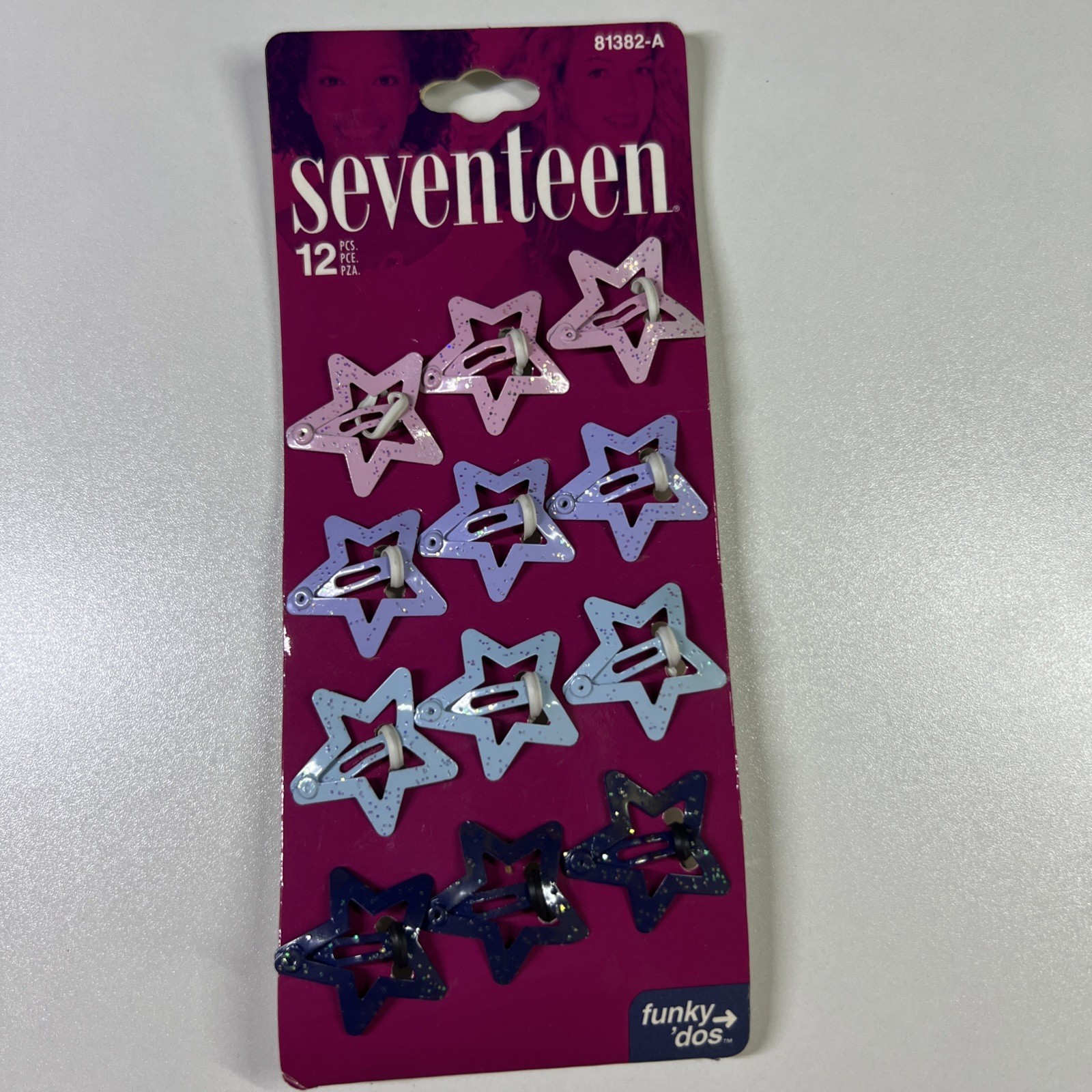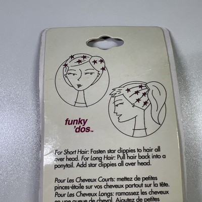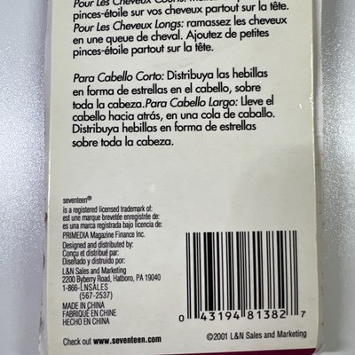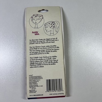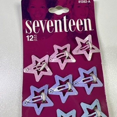 Bring back the early 2000s with this new-in-package set of Seventeen Funky ?Dos star hair clips! This card includes 12 metal snap barrettes in fun star shapes with glitter finishes?perfect for adding Y2K style to any look. Great for short or long hair?wear them all over or in a ponytail. Officially licensed by Seventeen magazine and dated 2001. A fun collectible or wearable accessory for #Y2K #Seventeen #HairClips #RetroStyle #2000sFashion.