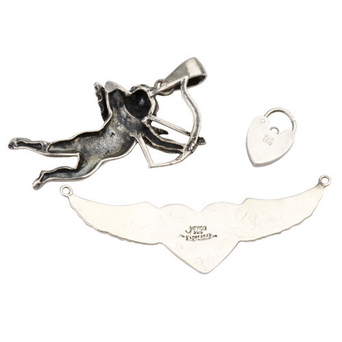 Trois Argent Sterling Symboles De Amour ; Coeur Avec Ailes , Verrou & Cupidon