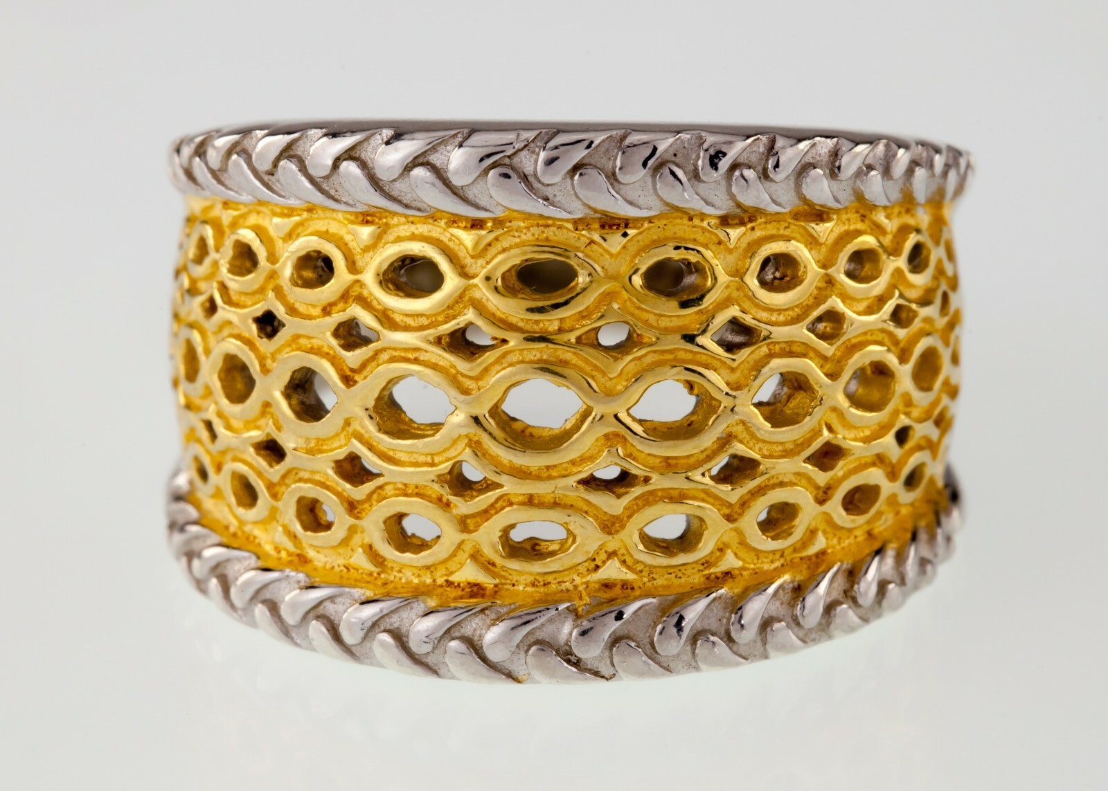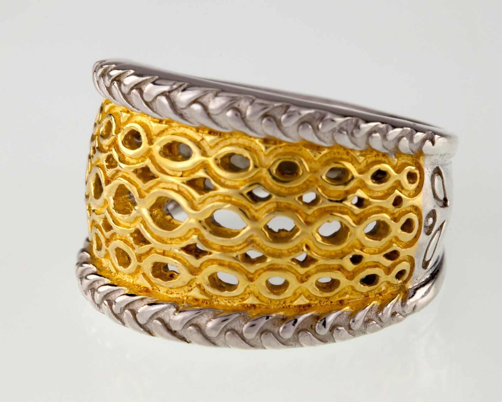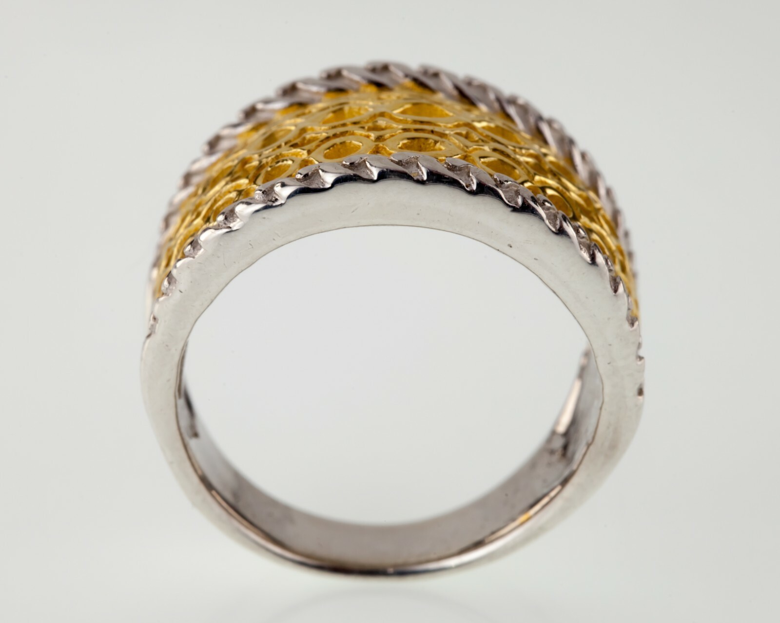 Magnifique anneau a deux tons avec motif en maille accent avec une riche ton d'or