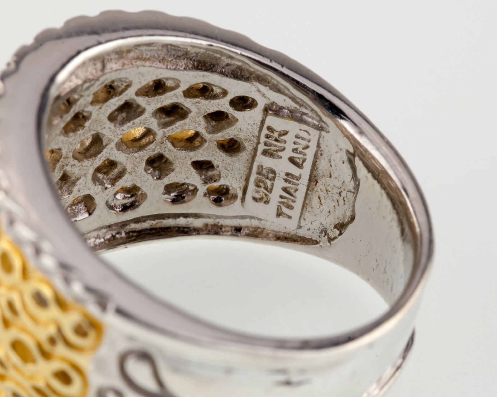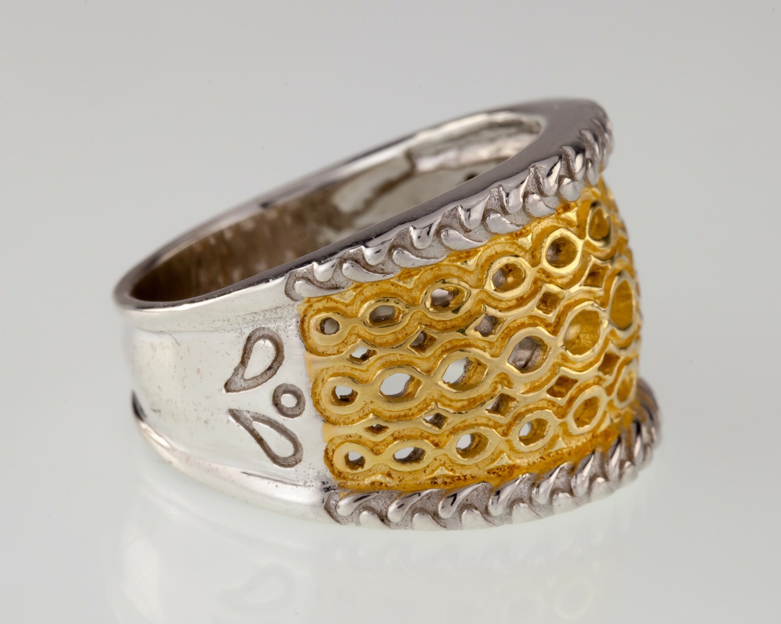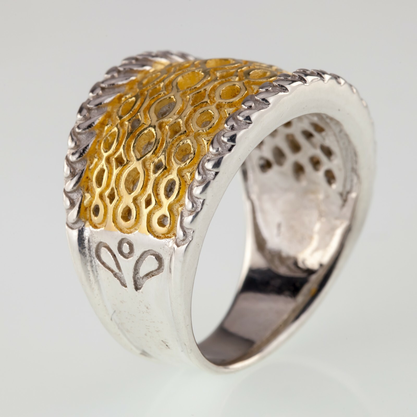 Magnifique anneau a deux tons avec motif en maille accent avec une riche ton d'or
