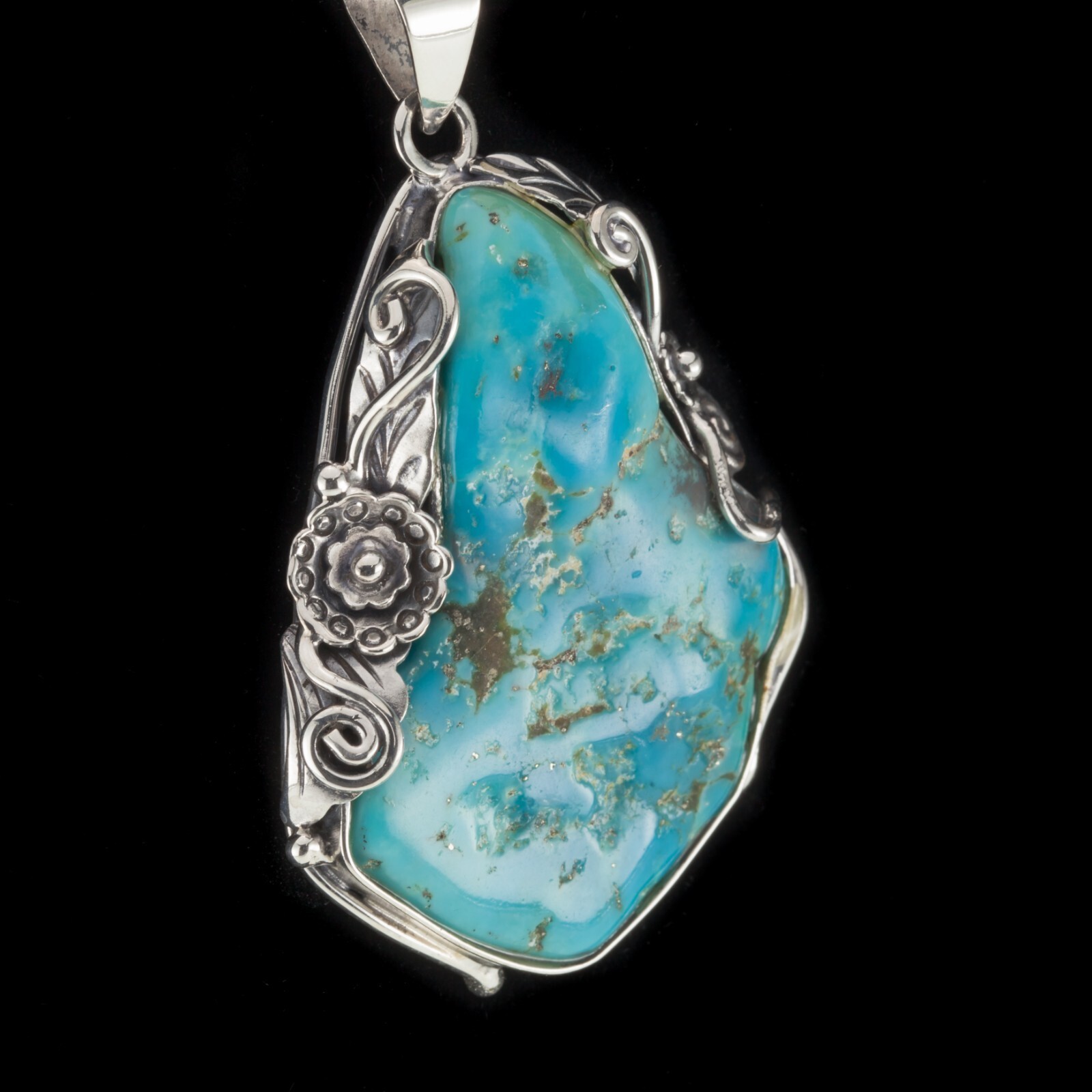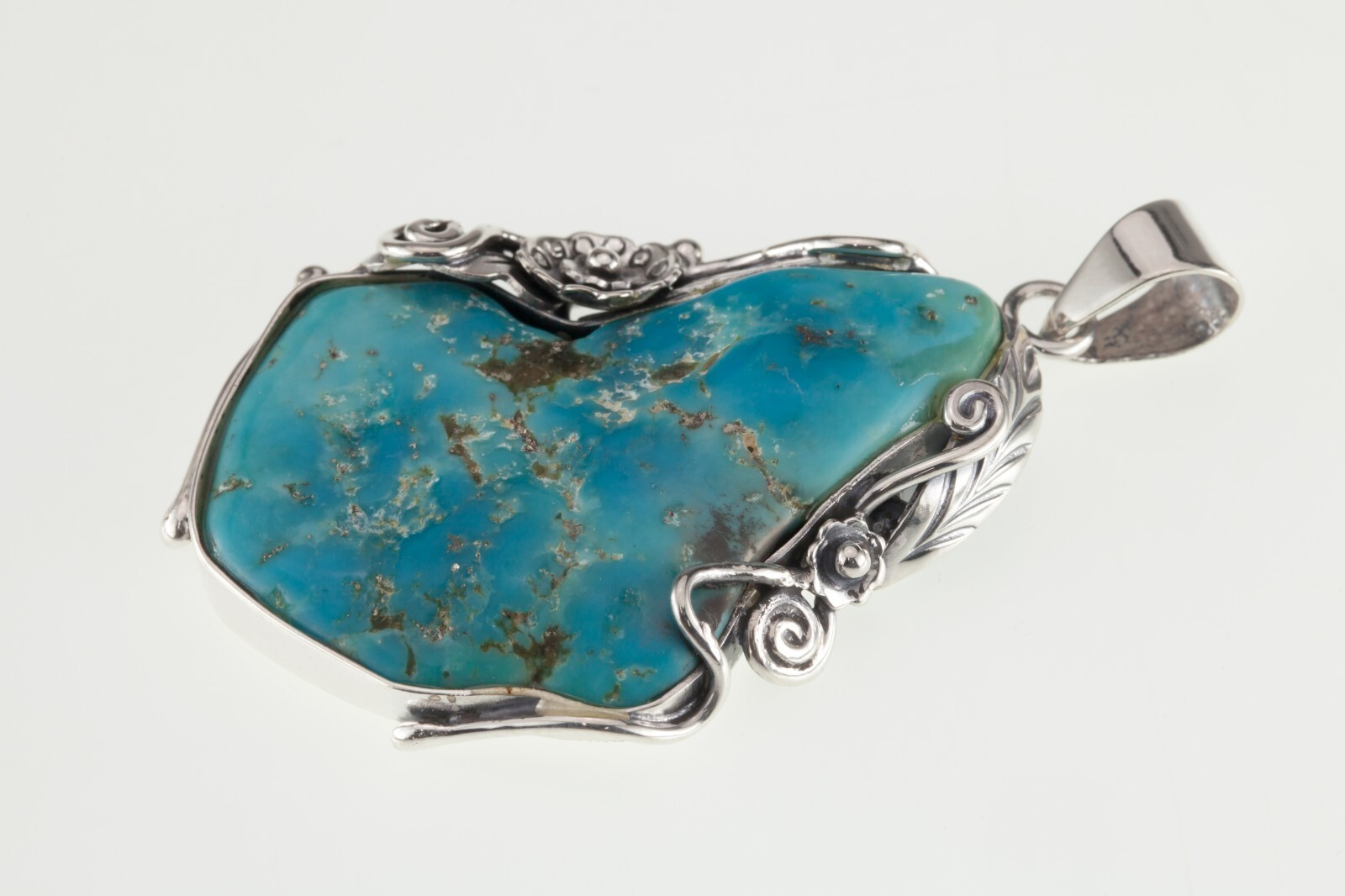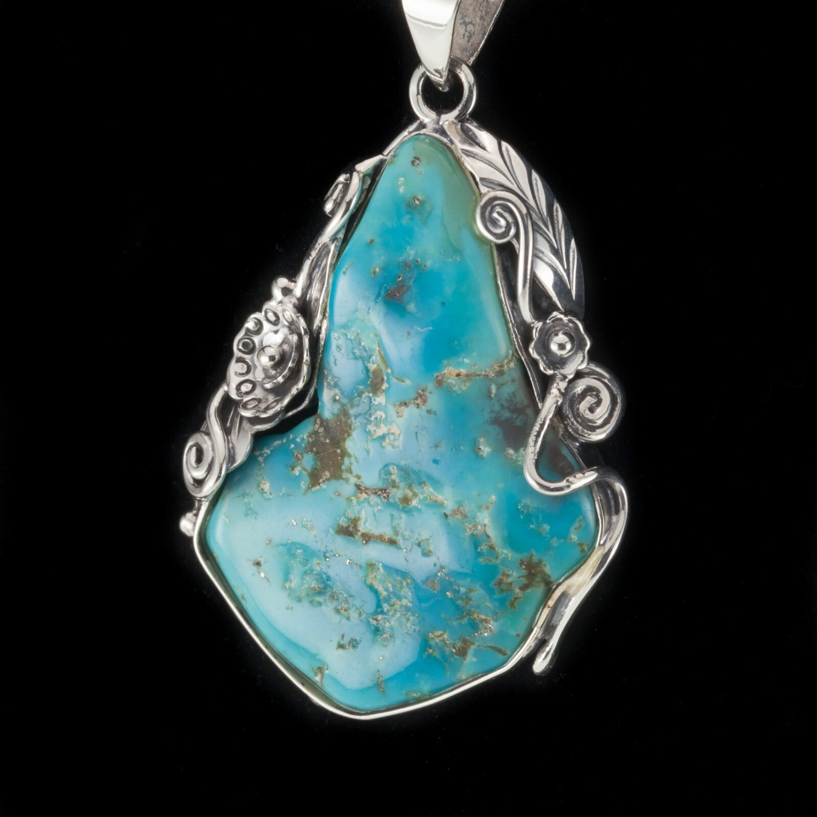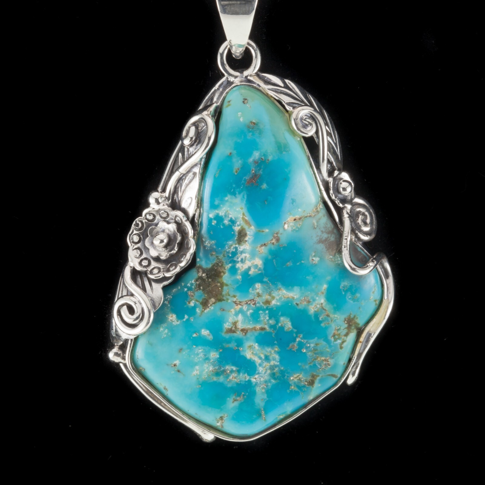 Incroyable pendentif en argent sterling turquoise sur un cadre floral