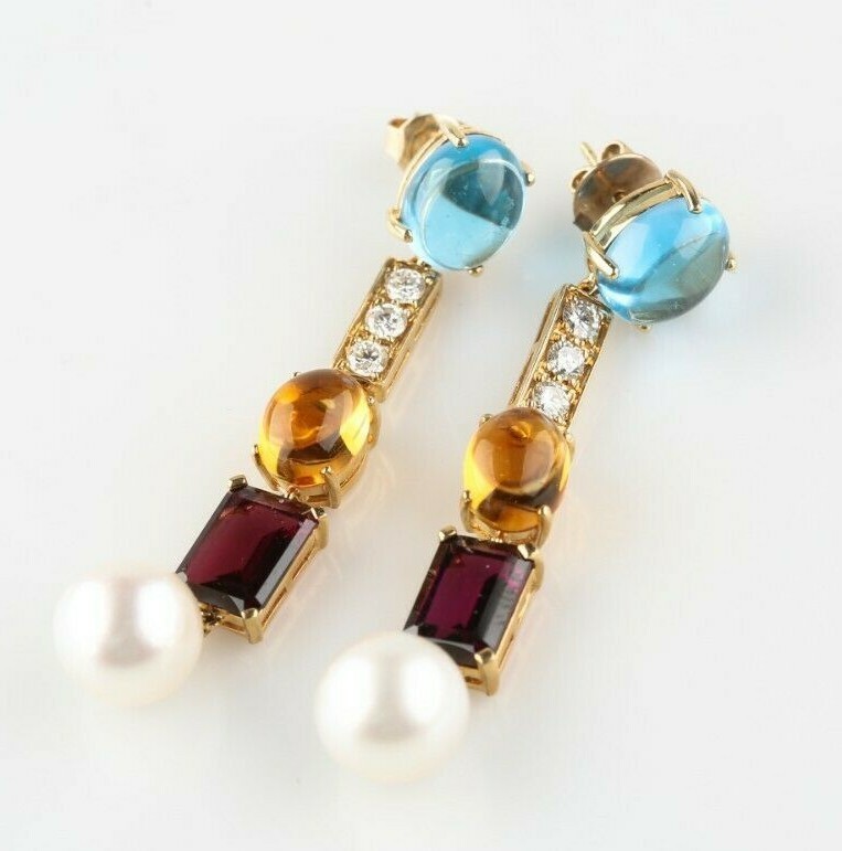 Boucles d'oreilles magnifiques et uniques en pierres precieuses multicolores, diamants et perles