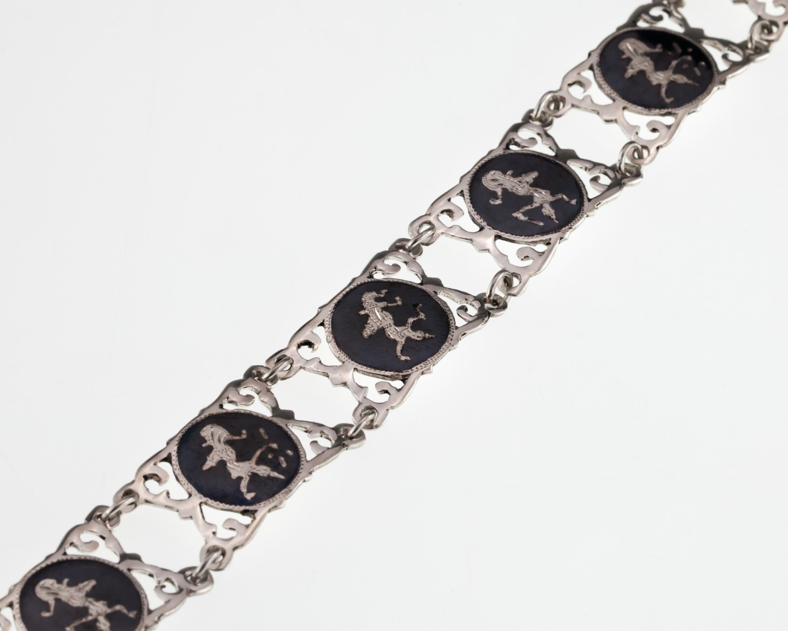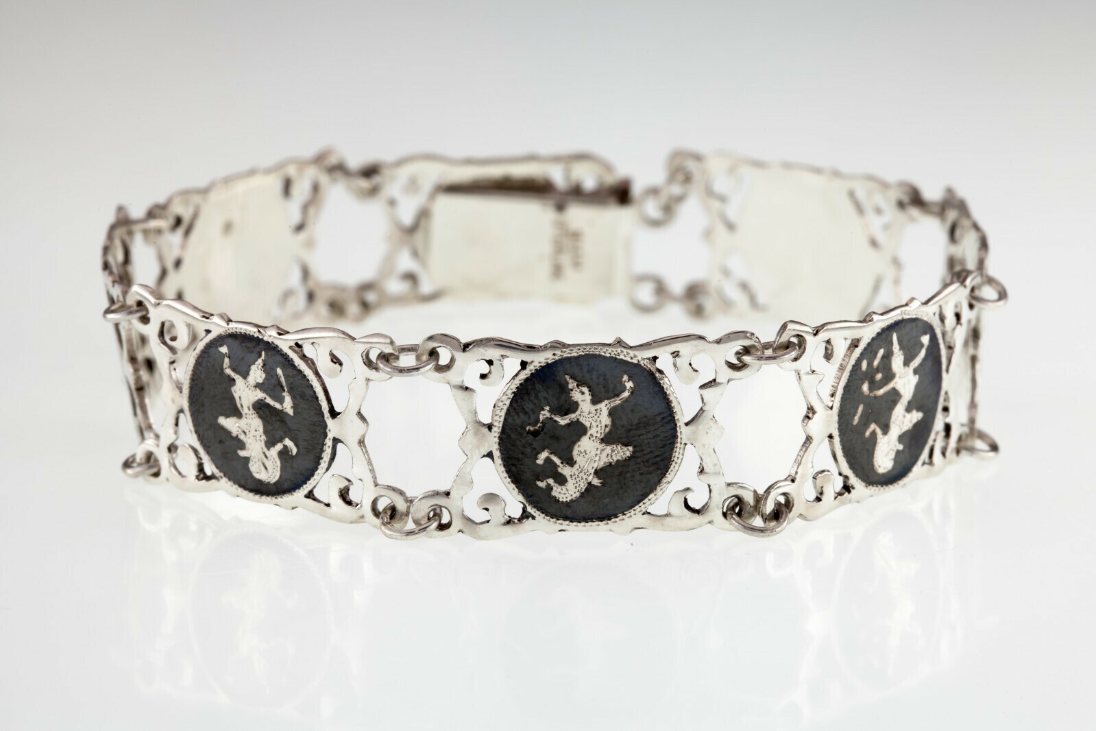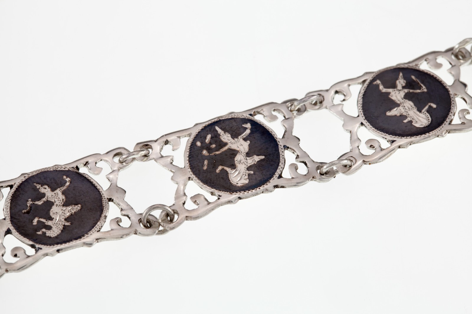 Vintage Thai Argent Siam Niello Émail Noir Panneau Bracelet 7.25 "