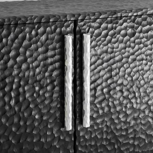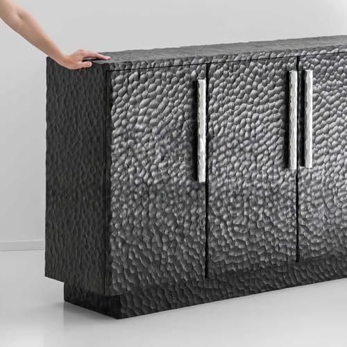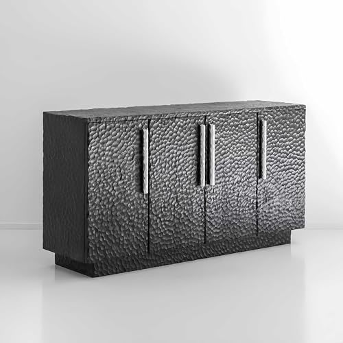Product description: Transform your entryway or living space with Interoknack's luxurious carved solid wood cabinet. This stunning 63" x 15.7" x 29.9" statement piece showcases distinctive hand-carved surfaces that create a dramatic sculptural effect, perfectly balancing organic texture with refined minimalist design. Four spacious doors conceal generous storage compartments for organizing household essentials while maintaining an elegant, clutter-free environment. Bold designer handles and a robust base enhance the cabinet's contemporary yet retro-inspired aesthetic, making it a true centerpiece in any home. Arriving fully assembled for immediate use, this solid wood cabinet features durable construction with expert joinery that ensures lasting performance. Whether used as a sideboard, storage chest, or entryway focal point, this versatile cabinet brings together traditional craftsmanship and modern luxury for a truly distinctive addition to your interior design.