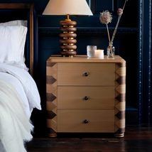 Product description: Transform your bedroom with this exquisite vintage solid wood striped bedside cabinet from Interoknack. This artisan-crafted statement piece combines retro minimalism with practical storage, featuring three deep drawers with smooth-gliding mechanisms for effortless access to your nightly essentials. Measuring 25.6" x 17.7" x 25.2", this cabinet showcases distinctive striped block accents that create visual interest while maintaining a sophisticated aesthetic. The cabinet arrives fully assembled, ready to enhance your master suite, guest room, or apartment with its creative silhouette and premium craftsmanship. Beyond functioning as a nightstand, this versatile piece works beautifully as a decorative side table or storage cabinet in various interior styles from classic to contemporary. The durable finish ensures easy maintenance while preserving the natural beauty of the solid wood construction.