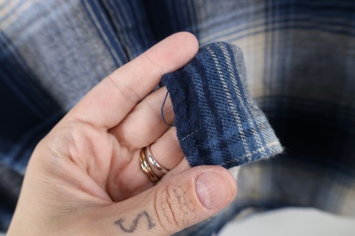 Missing button snap left cuff. Loose threads collar, cuffs, bottom hem. Collar, cuffs discolored. Color faded. Pilling