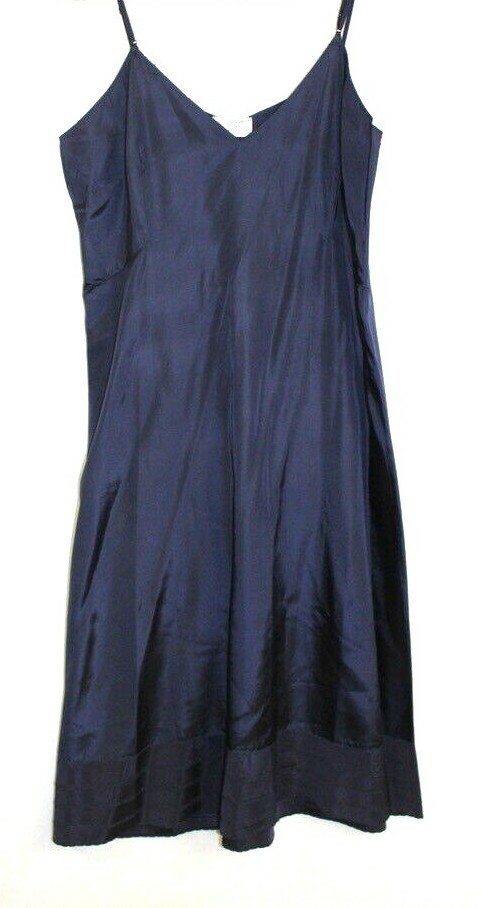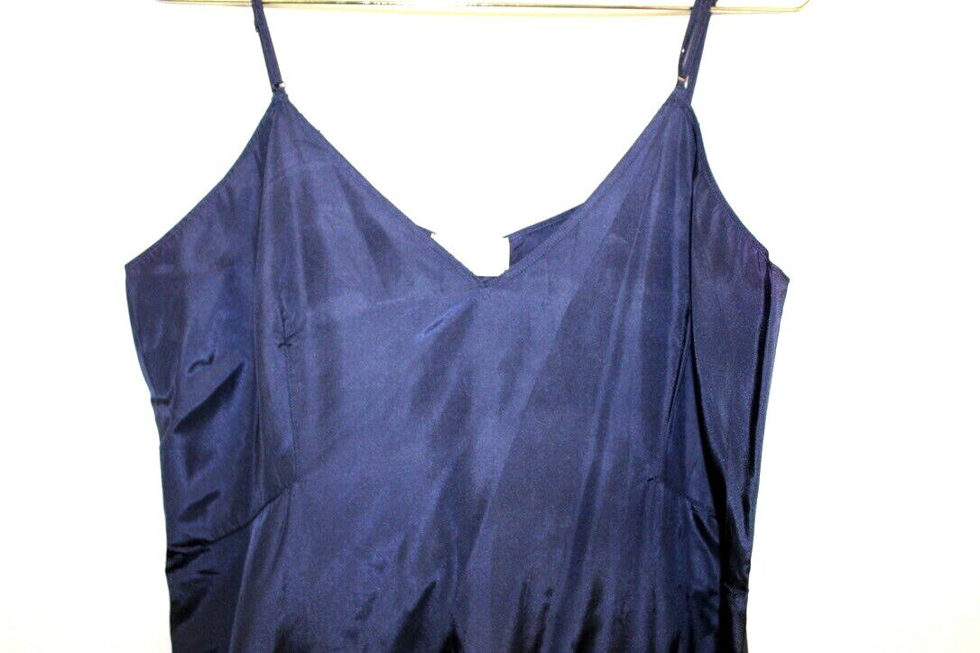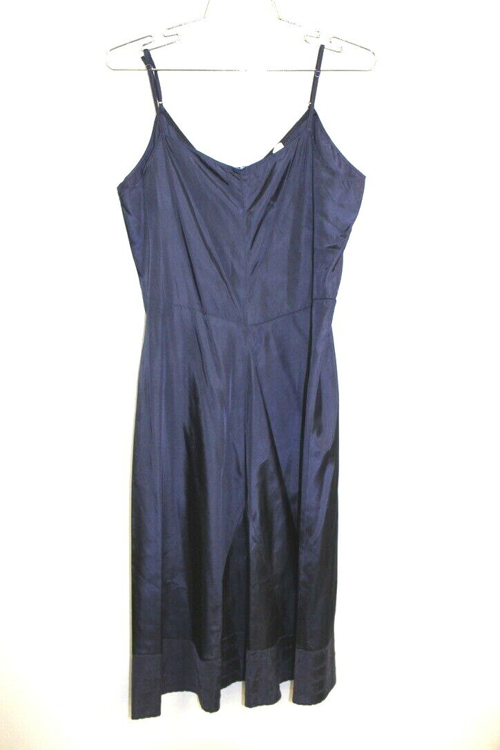 Vintage Navy lightweight slip of of Celanese Clairanese Acetate Taffeta which is very NOISY! Adjustable shoulder straps. Simple decorative hem with scalloped stitching creating a subtle scalloped edging. New, never worn!