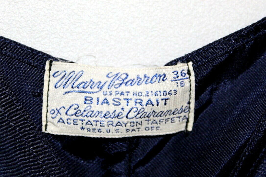 * Tag reads "Mary Barron - 36 /18- us pat. no 2161063 - BIASTRAIT of Celanese Clairanese Acetate Taffeta - reg us pat off"