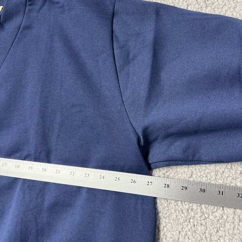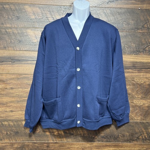 This vintage sweatshirt cardigan from The Vermont Country Store features a V-neckline with button closure and long sleeves in a cozy sweatshirt-like fabric. The XL size and unisex design make it suitable for both men and women. The cardigan is in a solid blue color with button accents, giving it a classic and timeless look perfect for casual wear or travel in the fall and spring seasons. Made in the United States, this cardigan embodies a vintage 80s and 90s style with a preppy and country-inspired theme.