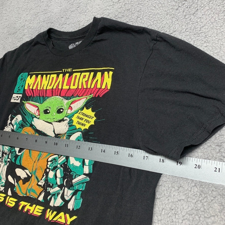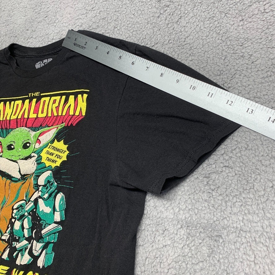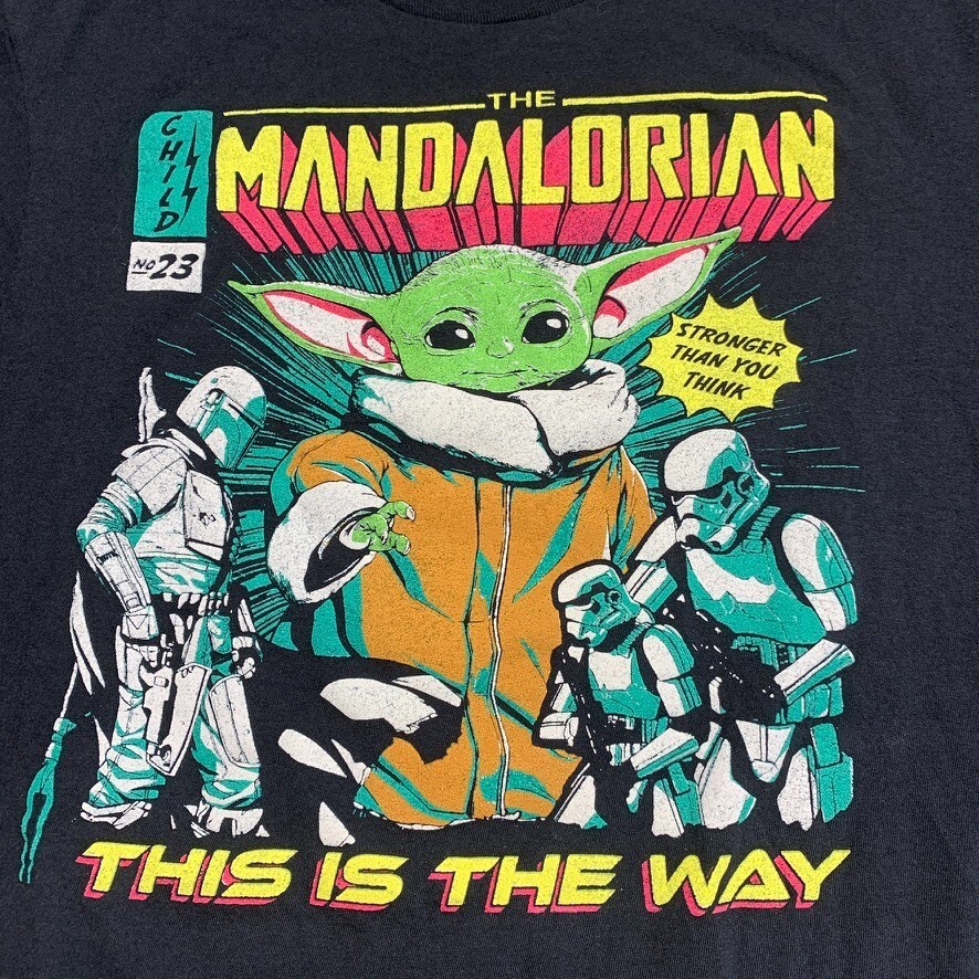 Show off your love for Star Wars with this black graphic tee featuring The Mandalorian. Made of 100% cotton fabric, this shirt is perfect for any season and features a round neckline and short sleeves. The logo accents add an extra touch of style to the shirt, making it a must-have for any fan.