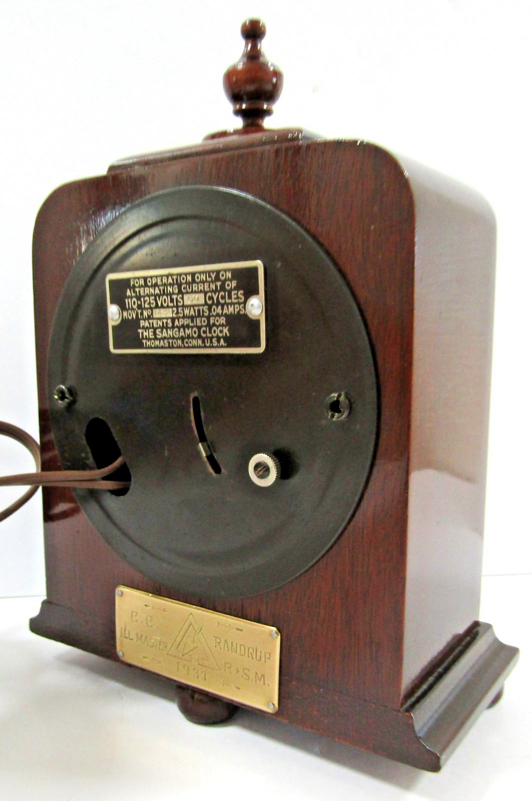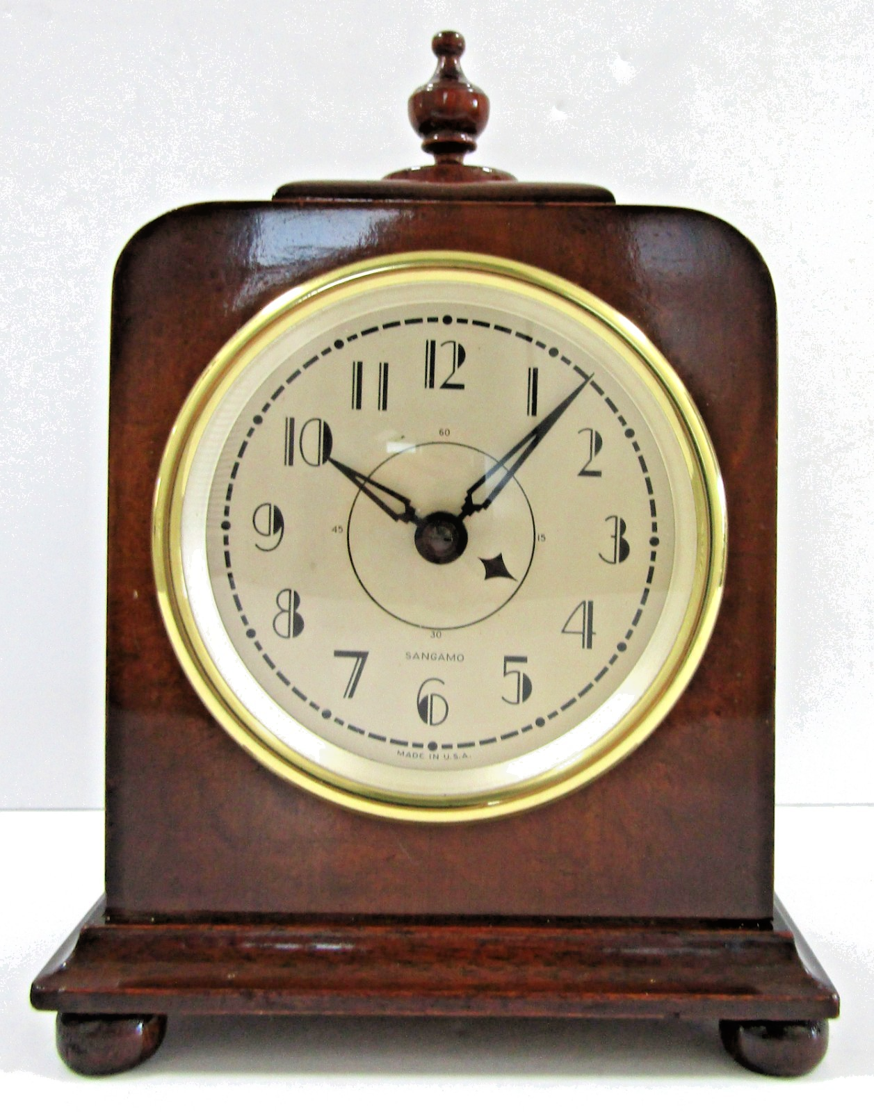 The Art Deco Hamilton-Sangamo 1930s Seldon Electric Clock is an antique desk clock from the early 20th century, featuring a rectangular shape with a brown mahogany finish. This plug-in electric clock with quartz movement boasts Arabic numerals and an Art Deco style, making it a decorative collectible for any room. Made of wood in the United States, this original clock is a unique piece of history that adds a touch of vintage charm to any space.
