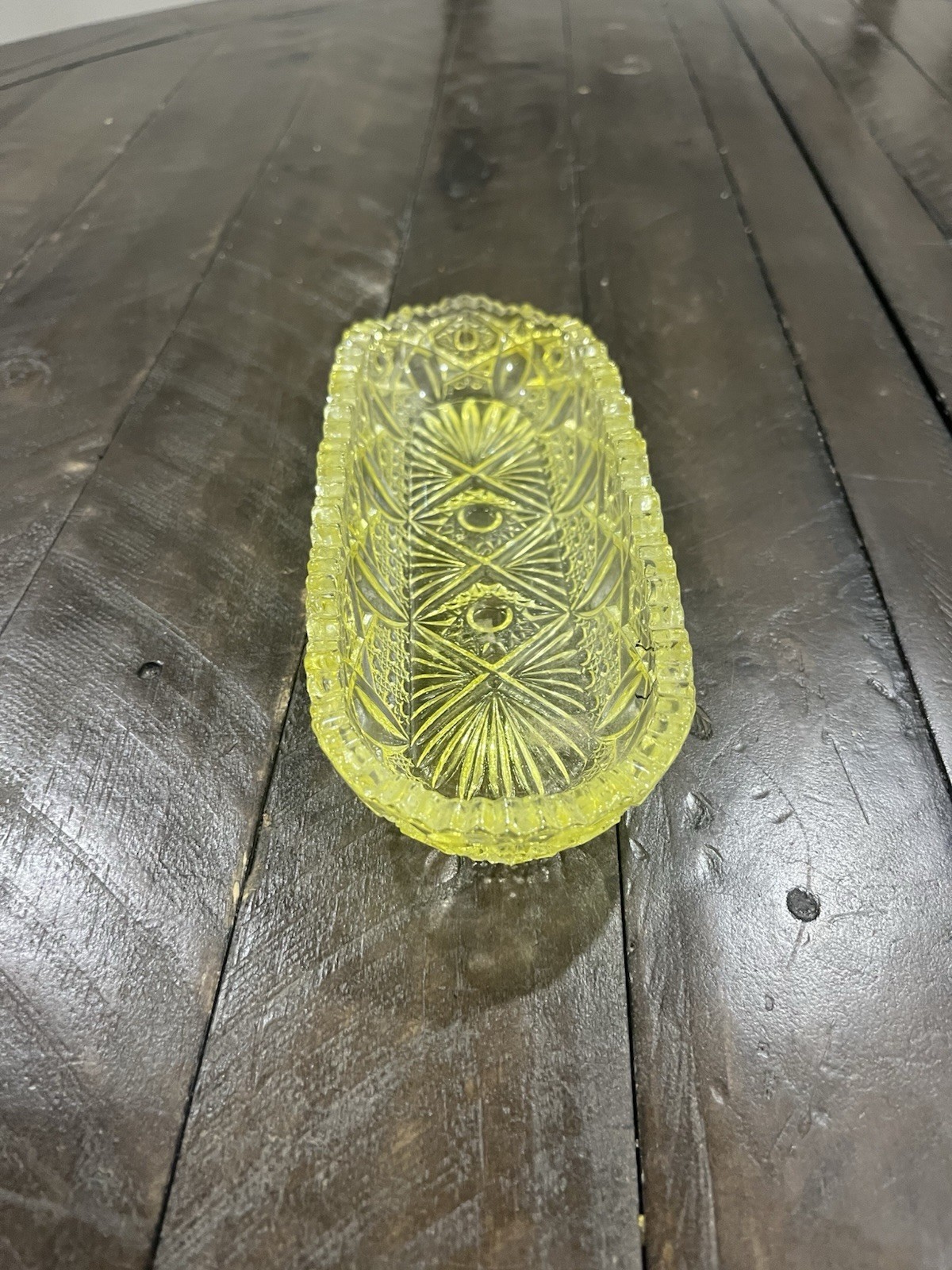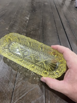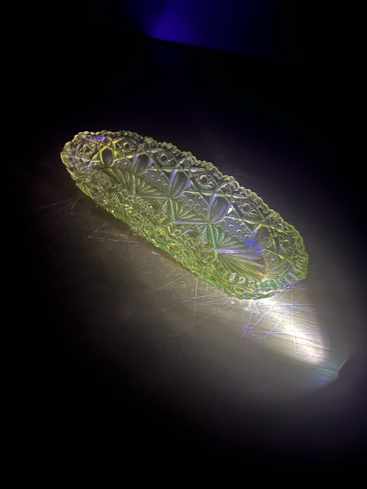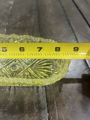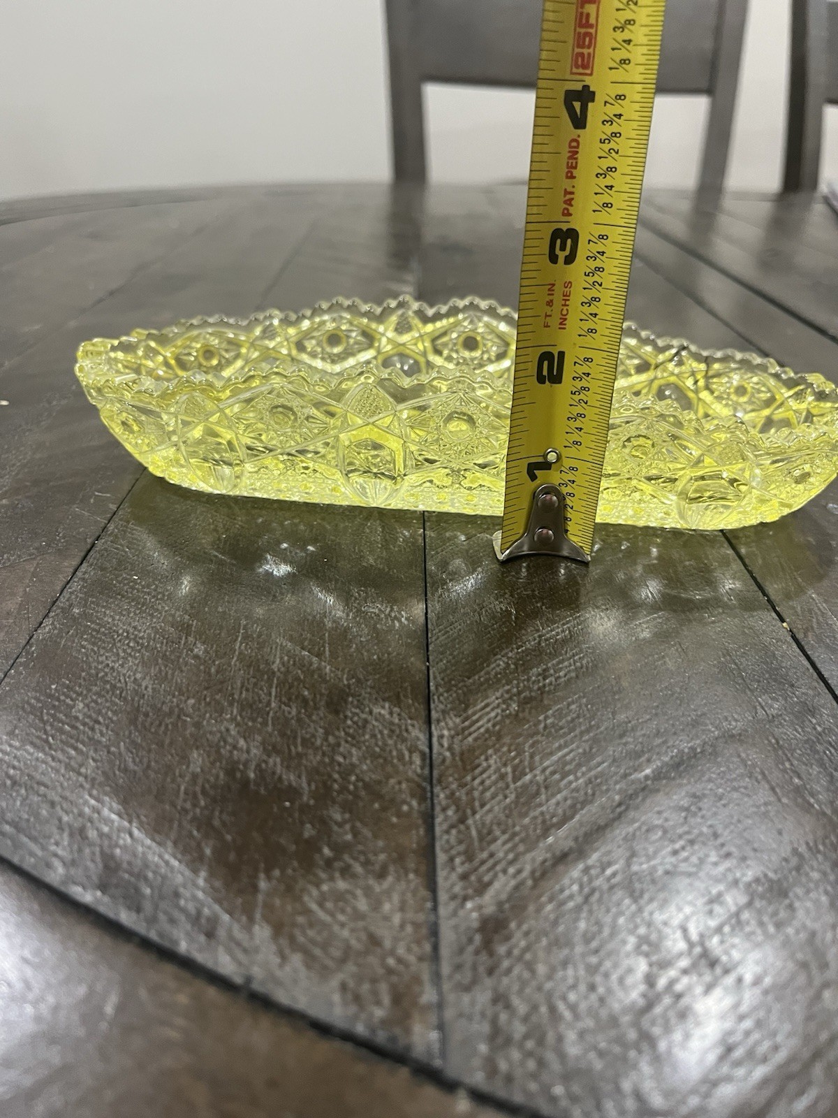 This vintage Uranium Glass Vaseline decorative art boat shape bowl is a unique and eye-catching piece that will glow a beautiful green color under black light. The pressed pattern and glossy finish give it a decorative and artistic look, perfect for all occasions. Made of glass, this 8.25" bowl is sure to add a touch of vintage charm to any home decor.