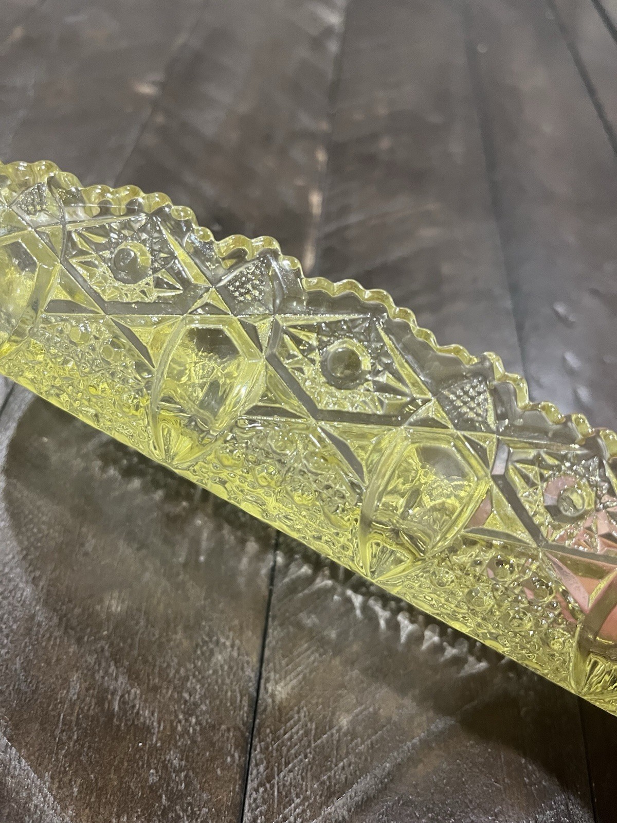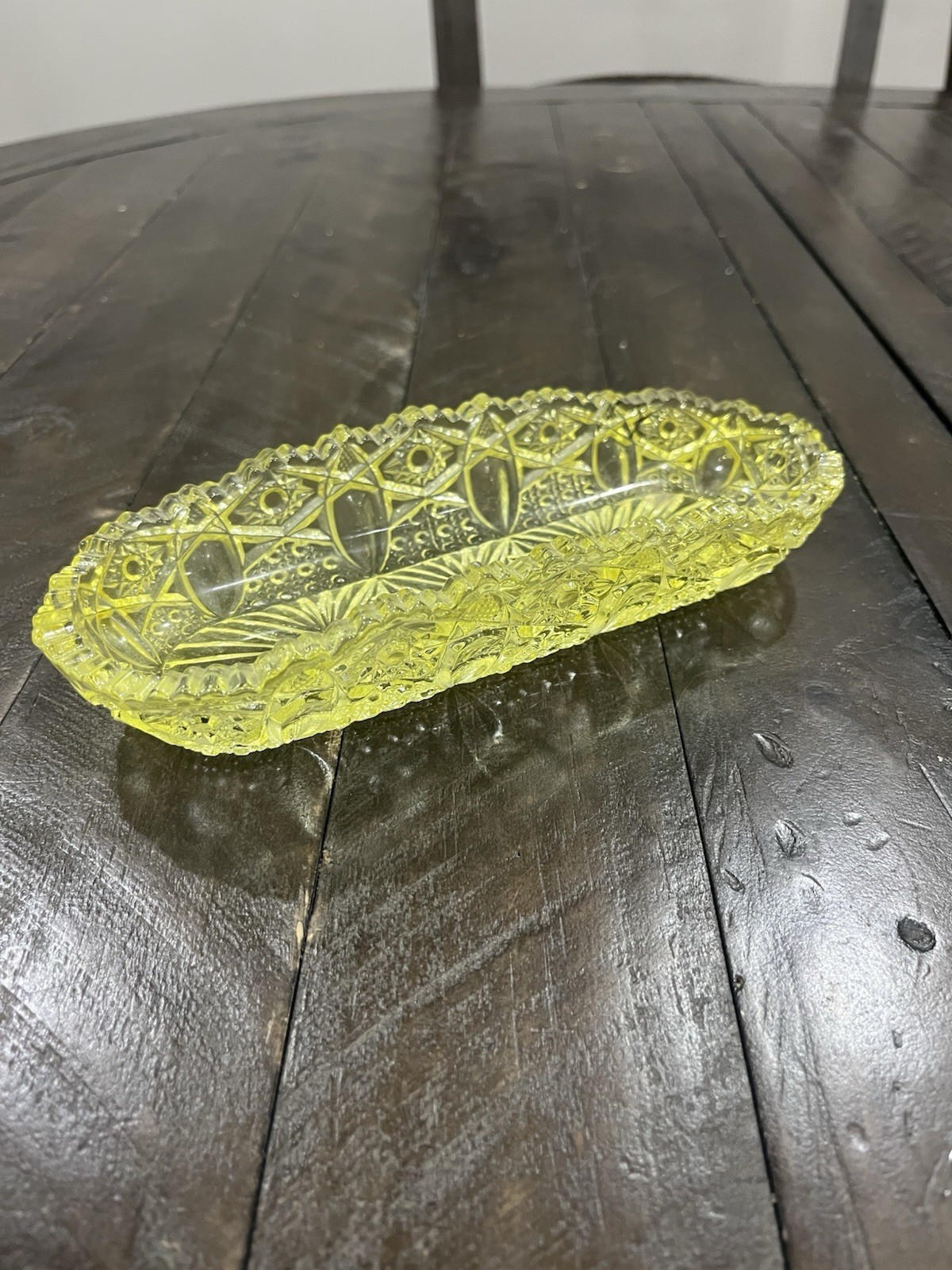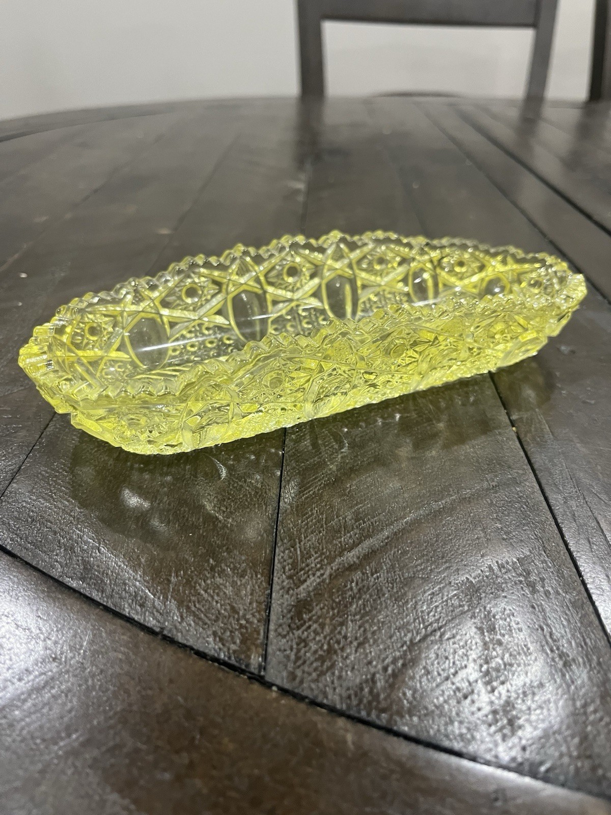 Vtg Uranium LE Smith Glass Vaseline Decorative Art Boat Shape Bowl Glows 8.25"